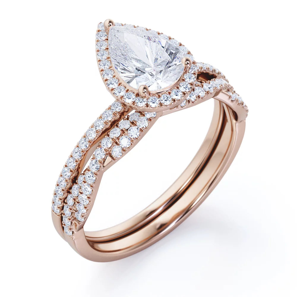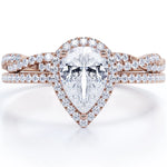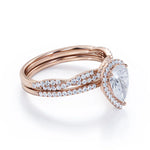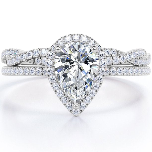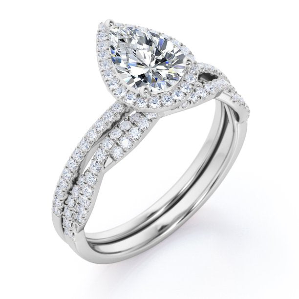 1.25 Carat pear cut Moissanite and Diamond Halo Wedding Ring Set in White Gold