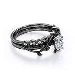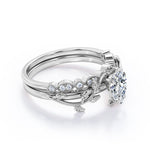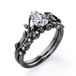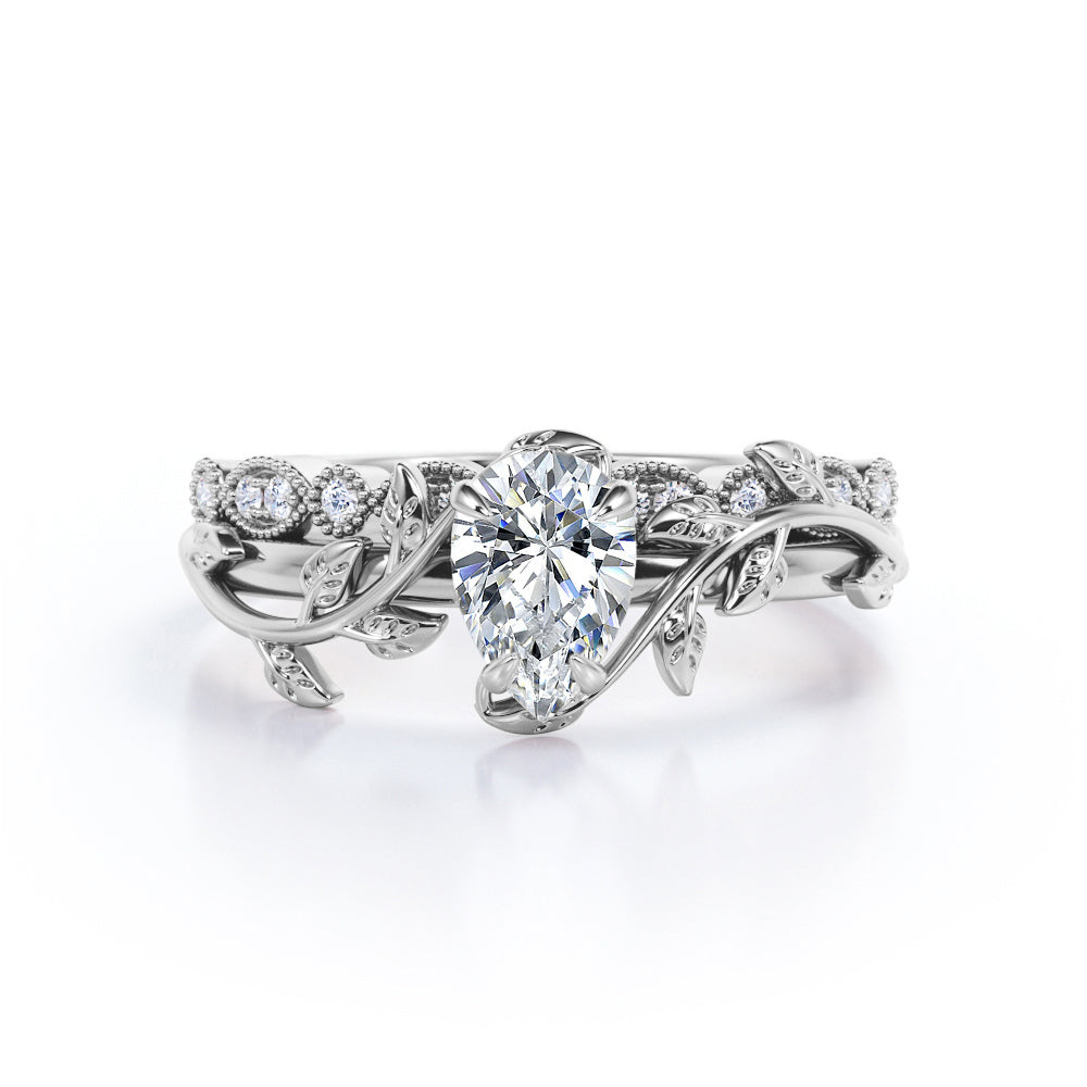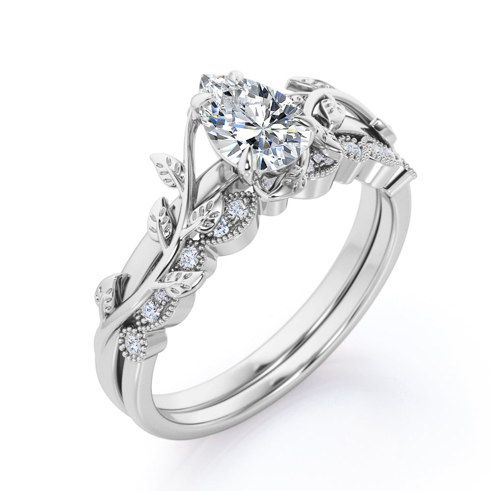 1.25 carat pear cut Moissanite and diamond vintage milgrain wedding ring set in white gold. Feel radiant in our pear cut regal Moissanite and diamond ring. This exclusive piece features 1 carat Moissanite engagement ring which exhibits strong brilliance and unbelievable sparkle and the vintage milgrain style in the wedding band which is filled with 0.25 carat of diamonds surely makes it one of a kind of ring that can grab the attention of anyone around. The modern art deco adds more value to the ring and makes it more special. If you are a vintage lover, this antique milgrain wedding ring set is the perfect option to go for. This 1.25 carat pear cut Moissanite and diamond vintage milgrain wedding ring set in white gold can also be customized to 18k Gold plating over silver, 10k Gold, 14k Gold or 18k Gold.