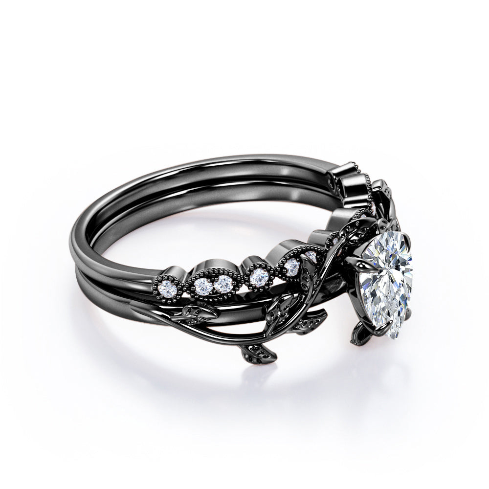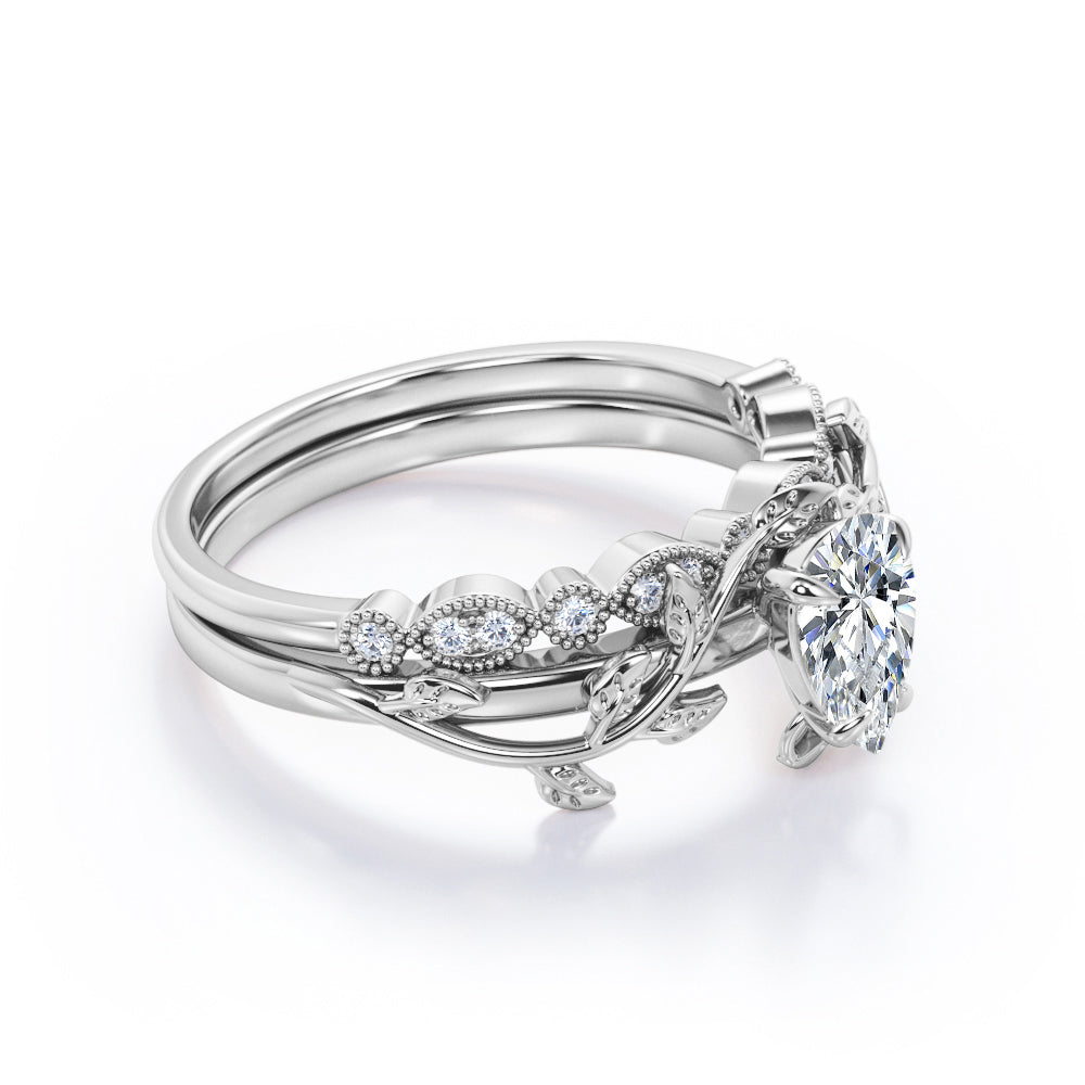 1.25 Carat Pear Cut Moissanite And Diamond Vintage Milgrain Wedding Ring Set In White Gold