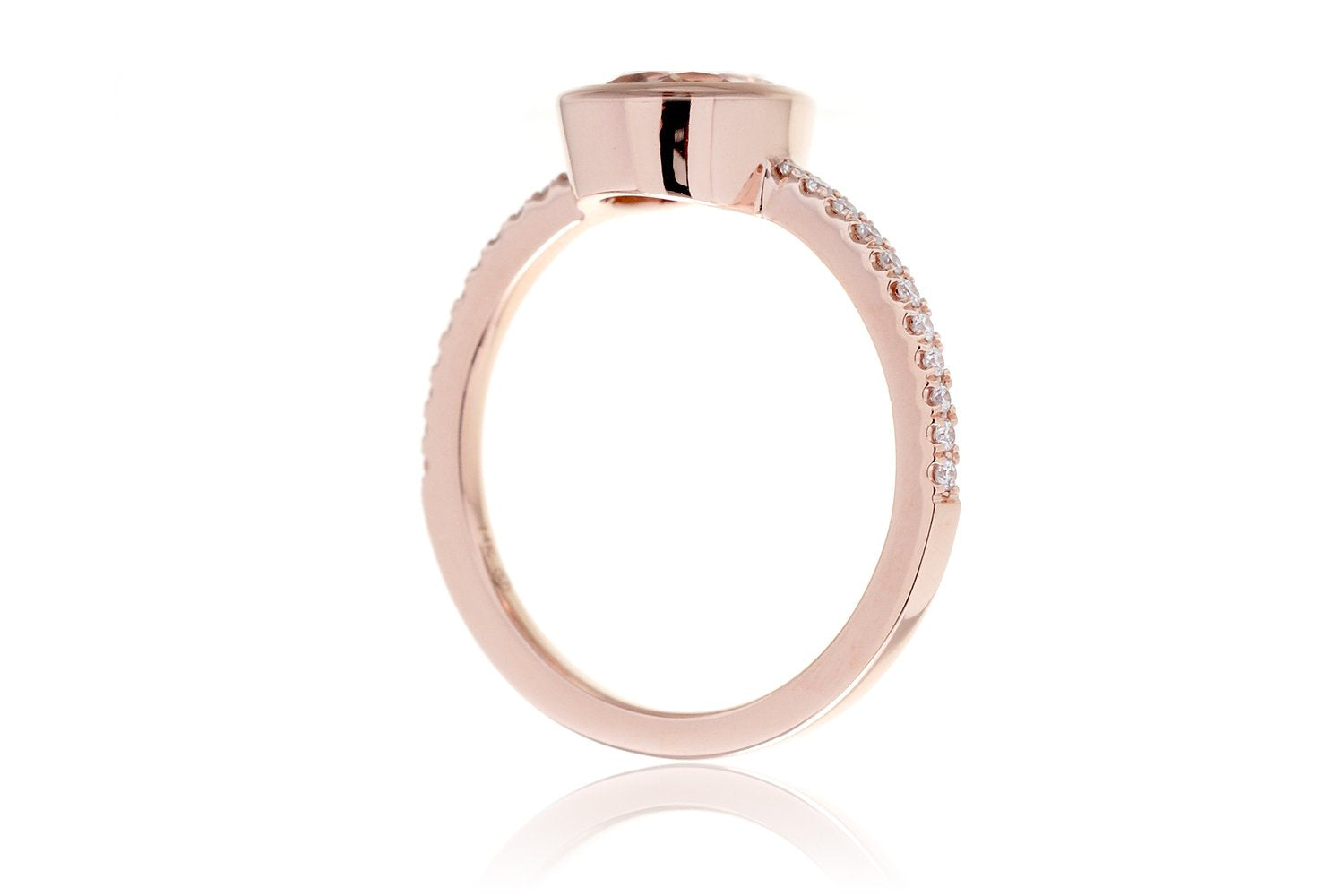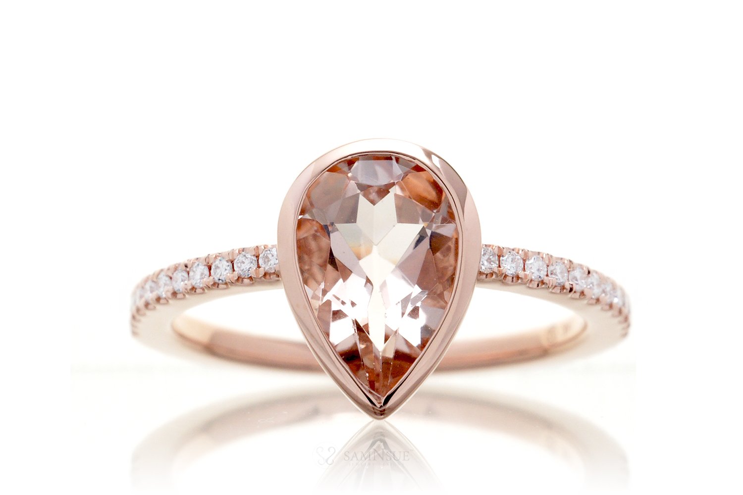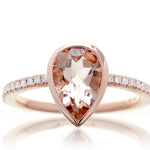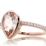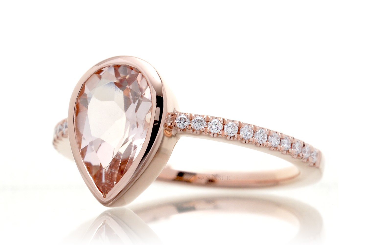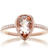 1.25 carat pear cut morganite and moissanite Bezel Set set engagement ring on 18k rose gold over silver. Handmade and customized to your requirement, the beautiful engagement ring celebrates true love at very affordable price. The beautiful and classic morganite engagement ring for women is sure to please her at very first sight. The bridal wedding ring is crafted in 18k Gold over Silver and made with real and high quality Moissanites that can be a perfect alternative to diamond rings as moissanites have almost the same durability and quality as with diamonds that will last for a lifetime.
