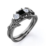 1.25 carat princess cut Black Diamond nature inspired wedding ring set in white gold. The refreshing design of this nature inspired Black Diamond wedding ring set allows it to stand out from the other traditional rings. This wedding set features three stone ring in princess cut and matching wedding band which weighs 1.25 carat in total. The prong setting in this ring gives it a timeless and classic look. The modern art deco in this wedding set is highly commendable work of our experienced craftsmen who created it with their own hands to offer you a variety. Grab this splendid wedding ring set in very affordable price before it gets out of stock. This 1.25 carat princess cut Black Diamond nature inspired wedding ring set in white gold can also be customized to 10k Gold, 14k Gold.