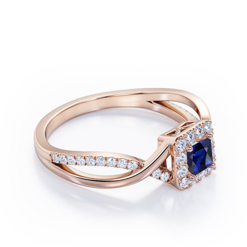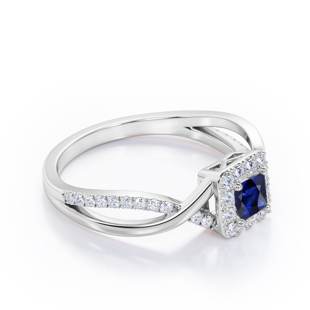 With this 1.25 Carat Princess Cut Blue Lab-Created Sapphire and diamond - Half Crossover Pave - Halo Engagement Ring in White Gold, you can make your proposal day unforgettable. Handcrafted with care into a wonderful princess cut by our lapidary expertise, this affordable engagement ring for women combines a a 1 carat princess cut Blue Lab-Created Sapphire stone in the center with 0.25 carat sparkling diamond side stones for a total carat weight of 1.25 carat. For those looking for something a little out of the ordinary, this Blue Lab-Created Sapphire ring for women is ideal for those who wish to express their charisma and uniqueness. With its dazzling beauty, this Lab-Created Blue Sapphire ring is magnificent with its glory and brilliance and will be an unmistakable addition to any jewelry collection. This gold Blue Lab-Created Sapphire band ring is stunning and inexpensive, thanks to its reasonable price. This Lab-Created Blue Sapphire wedding ring is regarded as a symbol of your undying devotion to your partner. This cheap wedding ring can be customized to your own choice of metal colors: white gold, rose gold, black gold, or yellow gold. Your love story will be complete with this Blue Sapphire engagement ring.
