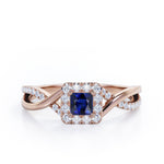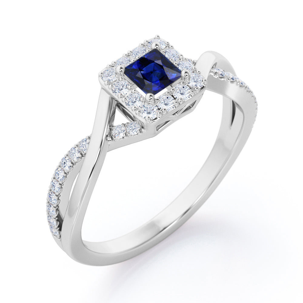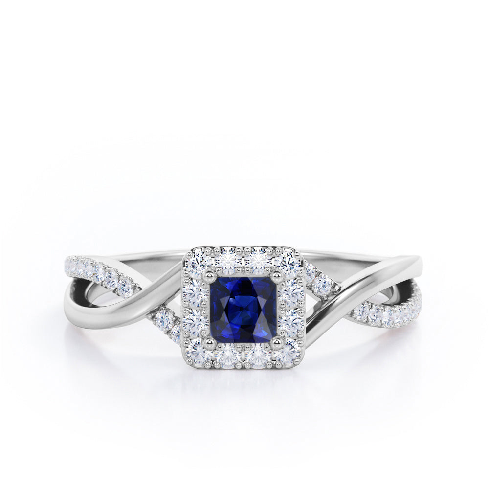 With this 1.25 Carat Princess Cut Blue Lab-Created Sapphire and diamond - Half Crossover Pave - Halo Engagement Ring in White Gold, you can make your proposal day unforgettable. Handcrafted with care into a wonderful princess cut by our lapidary expertise, this affordable engagement ring for women combines a a 1 carat princess cut Blue Lab-Created Sapphire stone in the center with 0.25 carat sparkling diamond side stones for a total carat weight of 1.25 carat. For those looking for something a little out of the ordinary, this Blue Lab-Created Sapphire ring for women is ideal for those who wish to express their charisma and uniqueness. With its dazzling beauty, this Lab-Created Blue Sapphire ring is magnificent with its glory and brilliance and will be an unmistakable addition to any jewelry collection. This gold Blue Lab-Created Sapphire band ring is stunning and inexpensive, thanks to its reasonable price. This Lab-Created Blue Sapphire wedding ring is regarded as a symbol of your undying devotion to your partner. This cheap wedding ring can be customized to your own choice of metal colors: white gold, rose gold, black gold, or yellow gold. Your love story will be complete with this Blue Sapphire engagement ring.