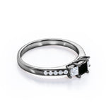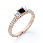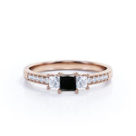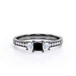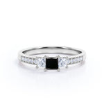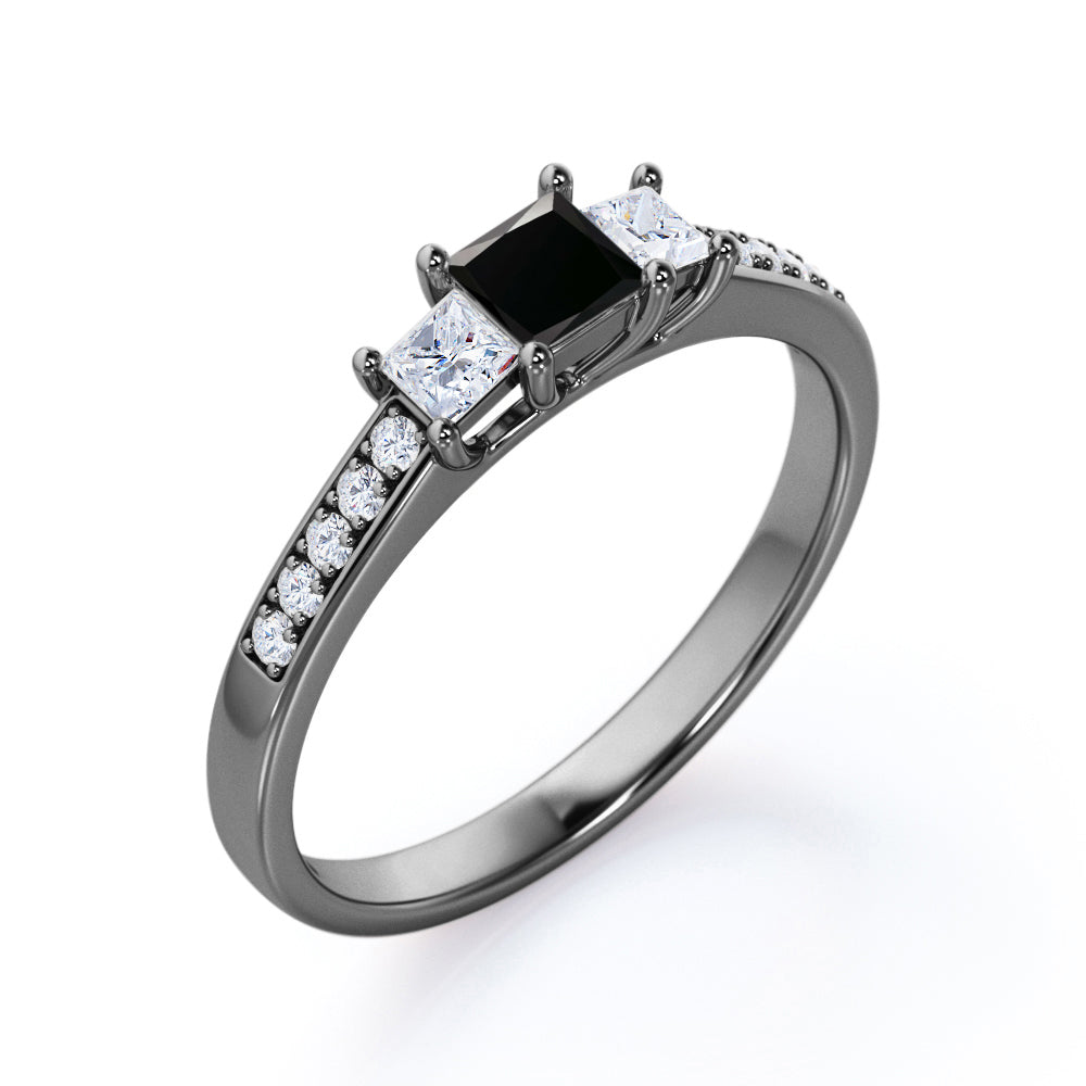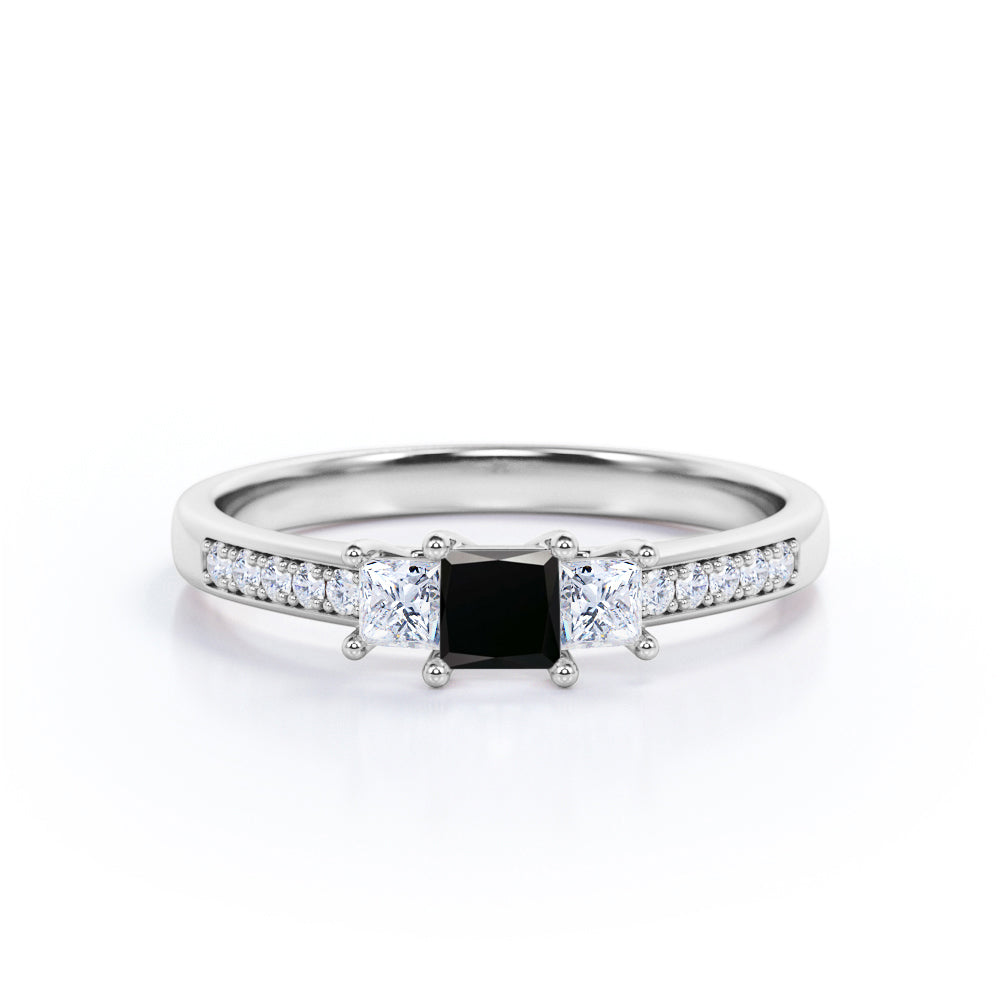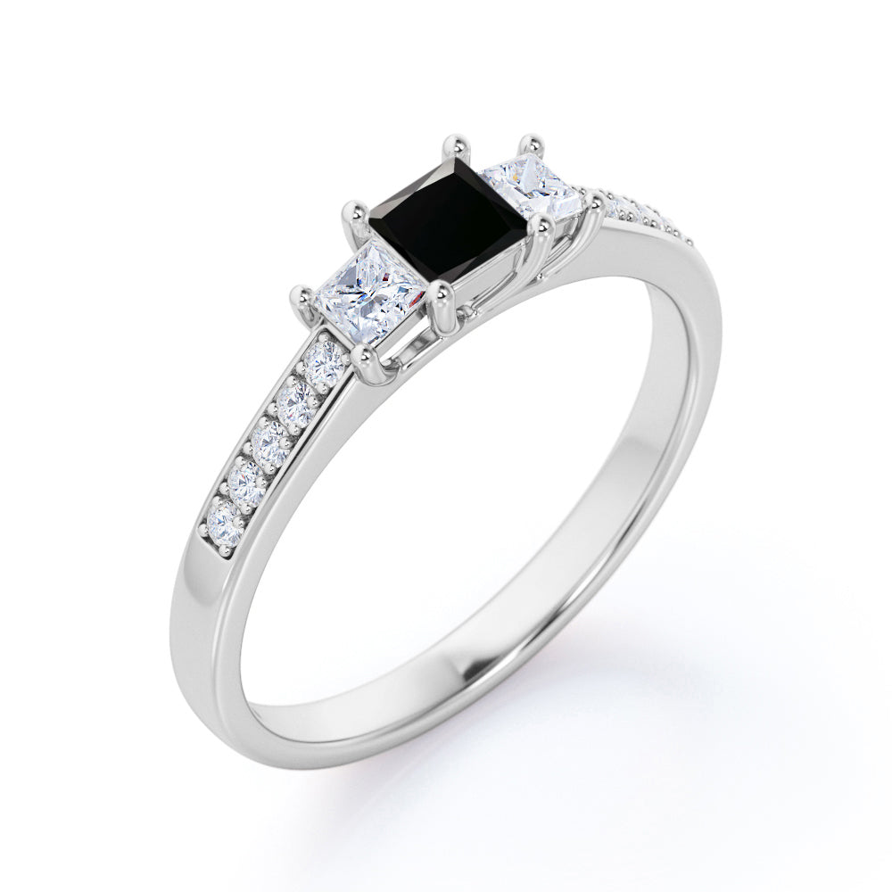 1.25 carat princess cut Lab Grown Black Diamond three stone trilogy engagement ring in white gold. Showcasing our exclusive Lab Grown Black Diamond ring which will be an absolute match for those who are looking for the symbol of eternal love and affection. This compelling engagement ring set of total 1.25 carat will open the doors of her heart for you. This princess cut Lab Grown Black Diamond engagement ring is handmade with utmost love and detailed attention by our artisans. The three stone in the ring surrounded by sparkling Lab Grown Black Diamonds illuminates a brilliant brilliance which will add that extra glow on your fingers on your big day. This 1.25 carat princess cut Lab Grown Black Diamond three stone trilogy engagement ring in white gold can also be customized to 10k Gold, 14k Gold as per your desire.