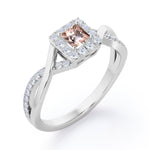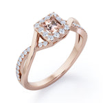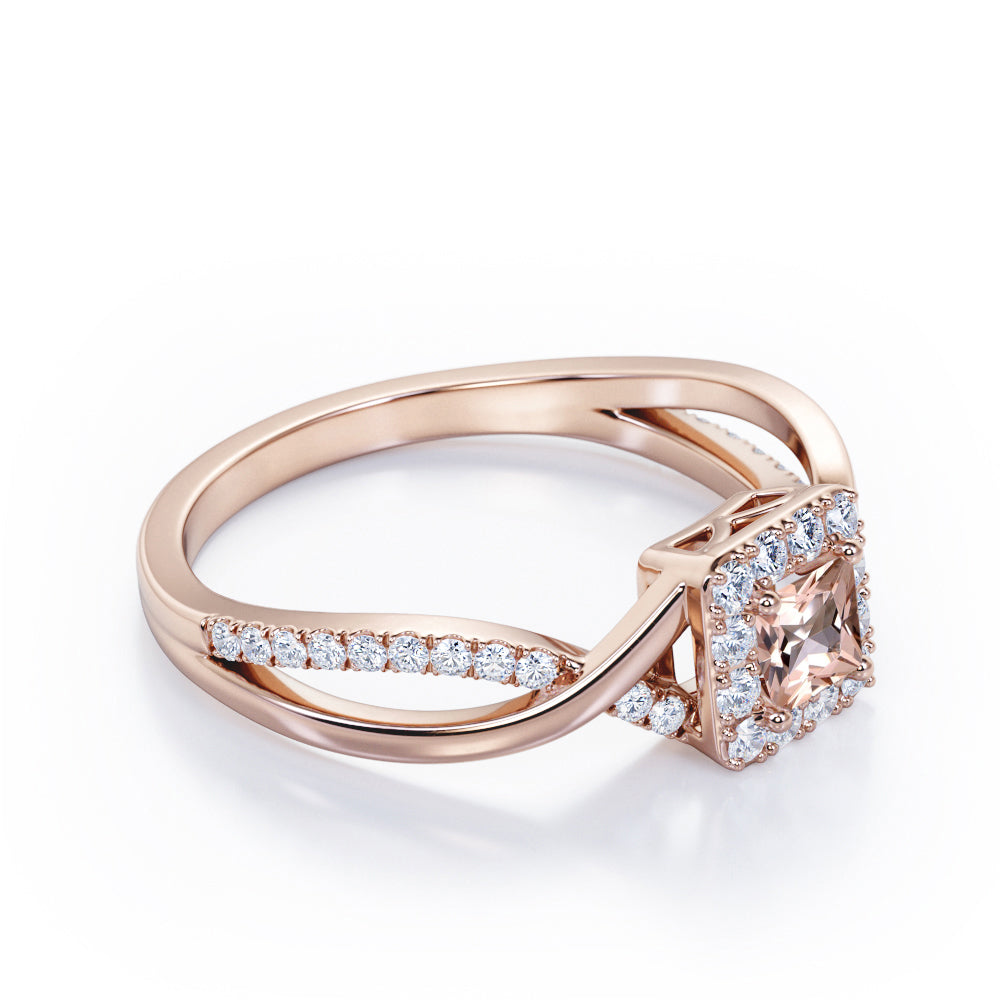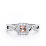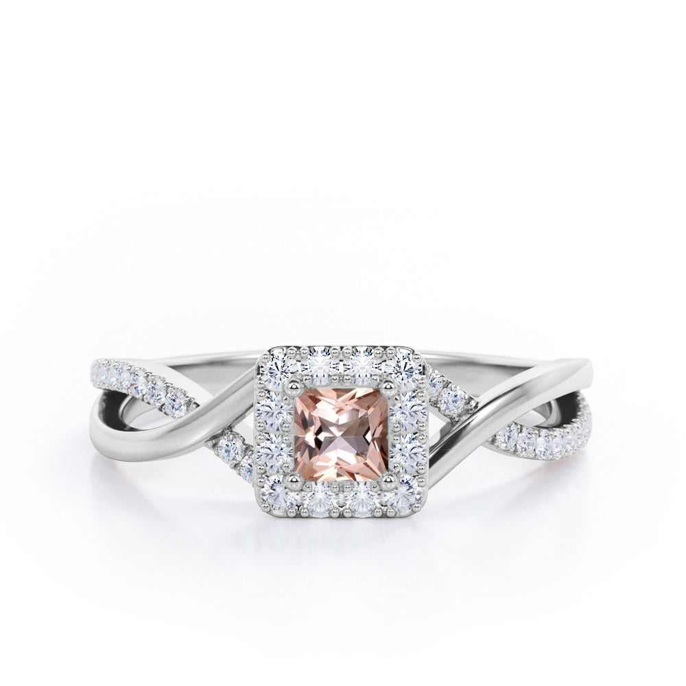 1.25 Carat Princess Cut Morganite and diamond - Half Crossover Pave - Halo Engagement Ring in White Gold