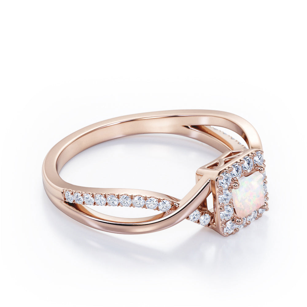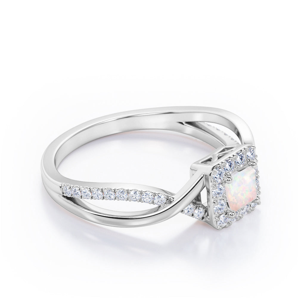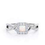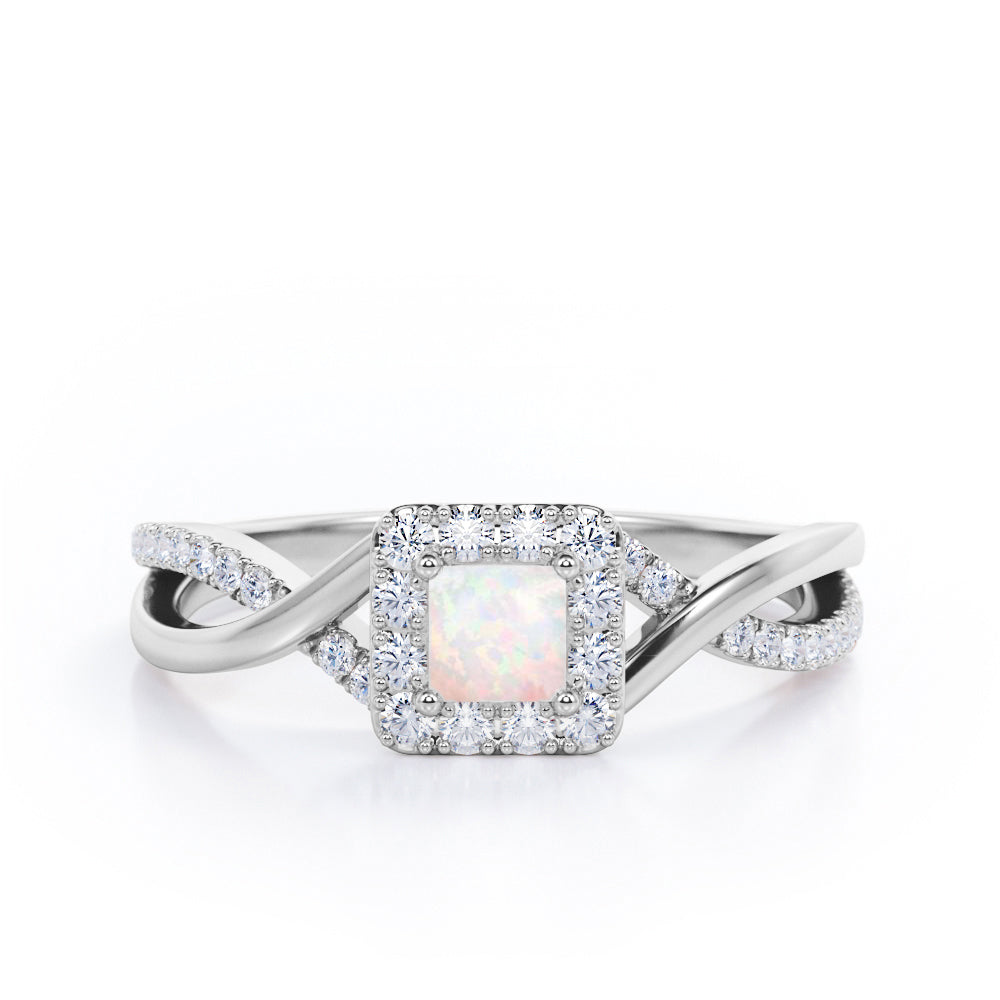 1.25 Carat Princess Cut Opal and diamond - Half Crossover Pave - Halo Engagement Ring in White Gold