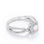 With this 1.25 Carat Princess Cut Opal and diamond - Half Crossover Pave - Halo Engagement Ring in White Gold, you can make your proposal day unforgettable. Handcrafted with care into a wonderful princess cut by our lapidary expertise, this affordable engagement ring for women combines a solid 1 carat princess cut Opal in the center with 0.25 carat sparkling diamond side stones for a total carat weight of 1.25 carat. For those looking for something a little out of the ordinary, this Opal ring for women is ideal for those who wish to express their charisma and uniqueness. With its dazzling beauty, this real Opal ring is magnificent with its adularescence and iridescence and will be an unmistakable addition to any jewelry collection. This gold Opal band ring is stunning and inexpensive, thanks to its reasonable price. This real Opal wedding ring is regarded as a symbol of your undying devotion to your partner. This cheap wedding ring can be customized to your own choice of metal colors: white gold, rose gold, black gold, or yellow gold. Your love story will be complete with this Opal engagement ring.