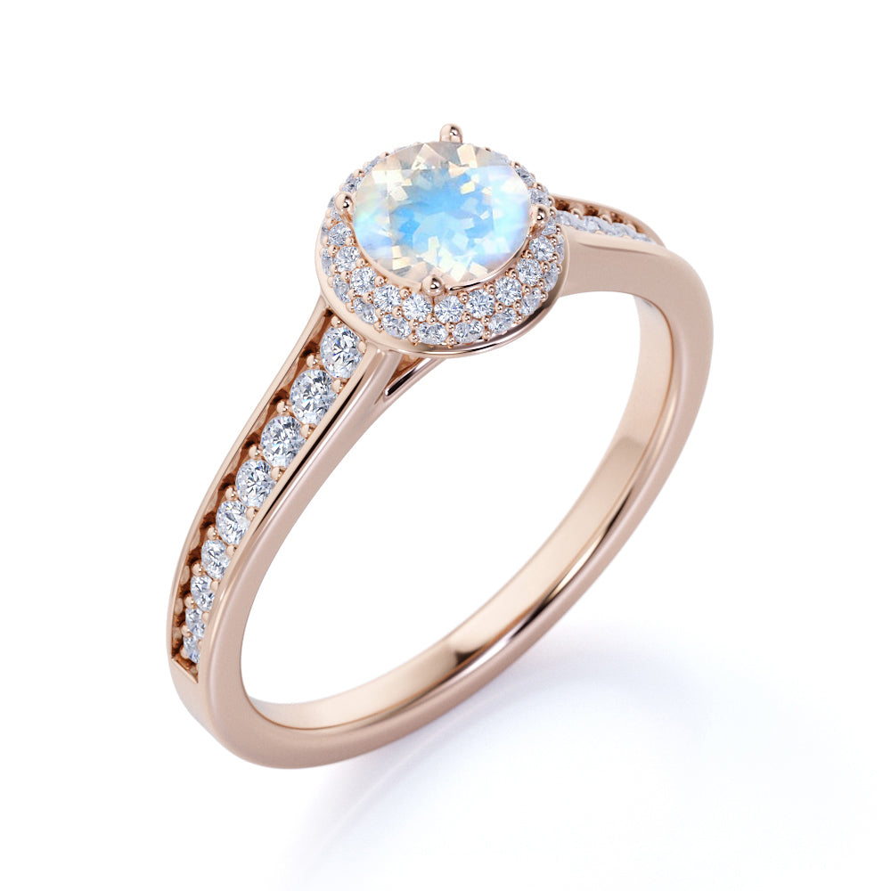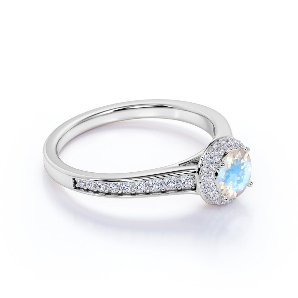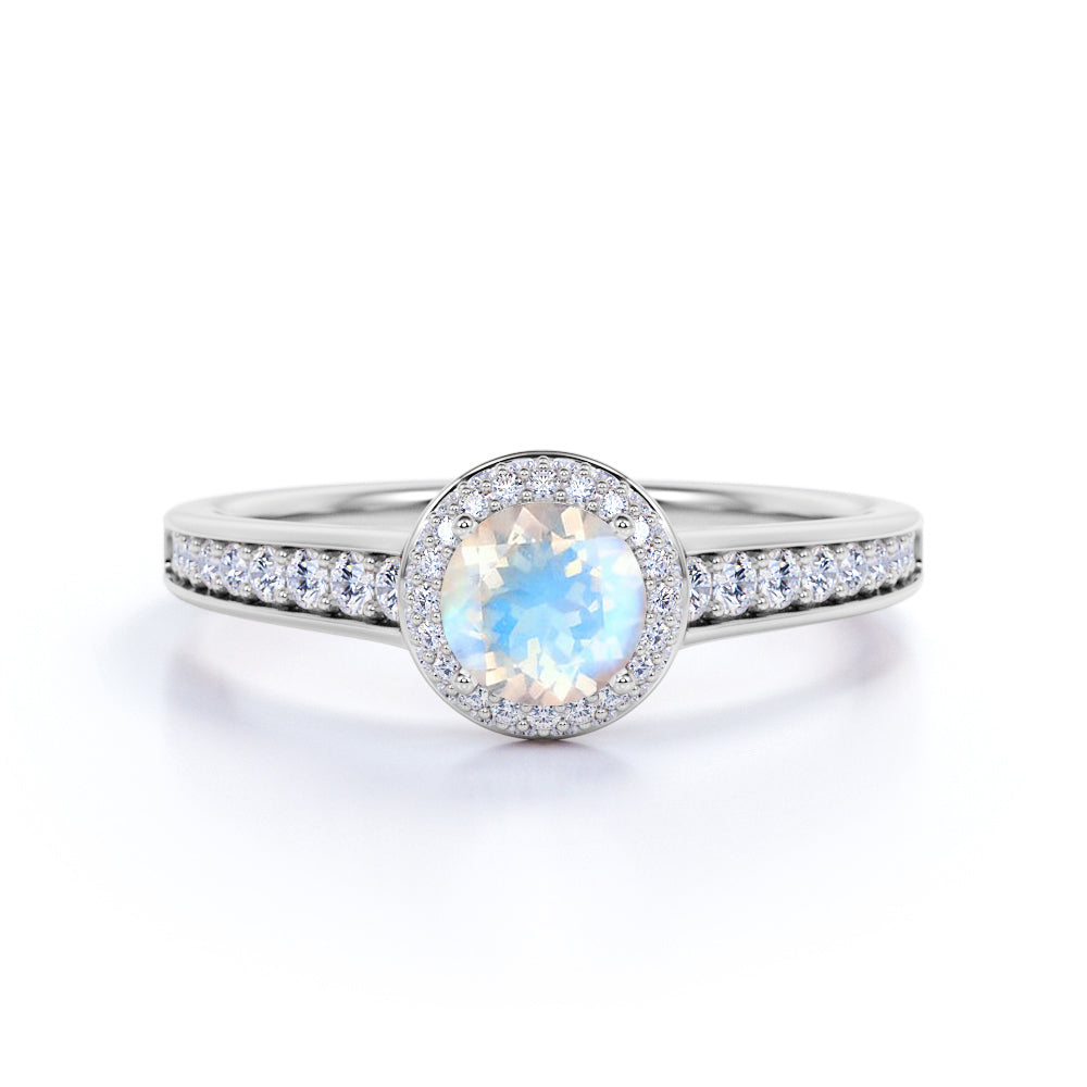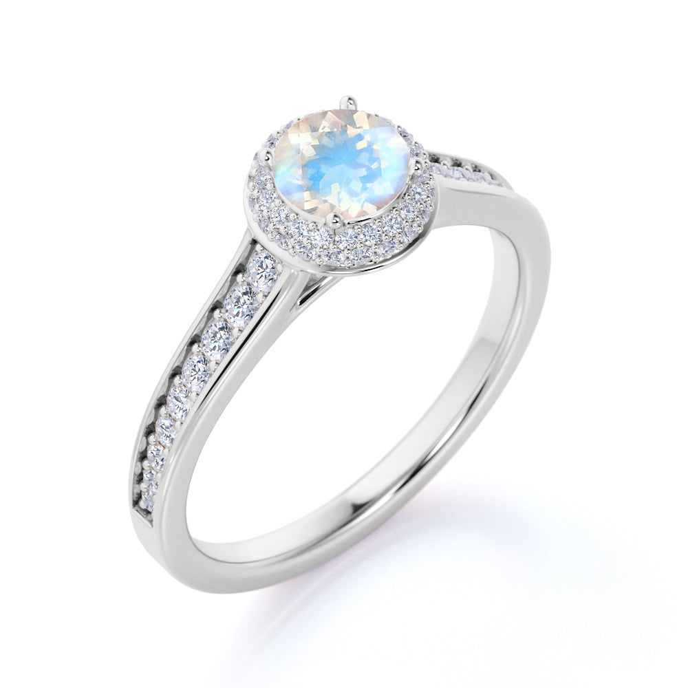 1.25 Carat Round Moonstone Halo Ring in White Gold - Rainbow Moonstone Wedding Ring