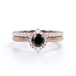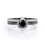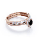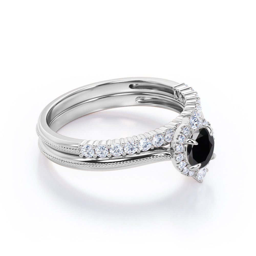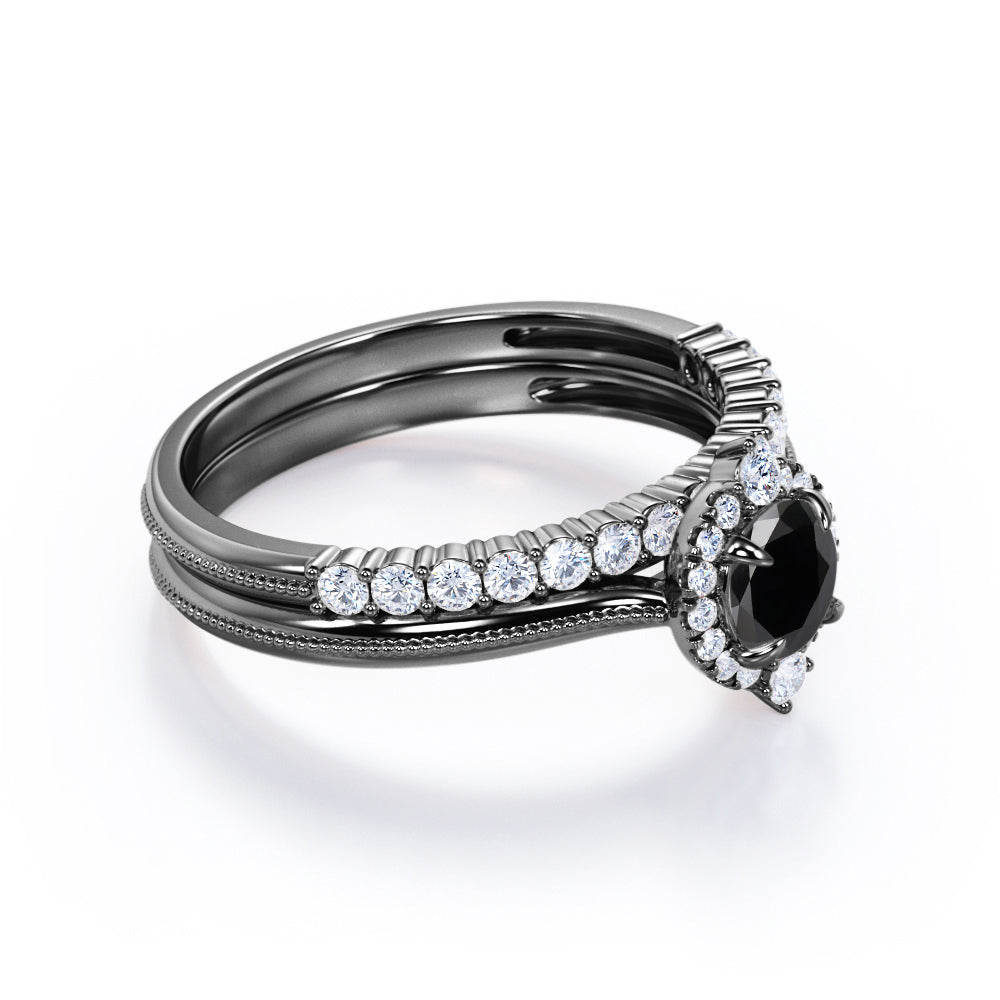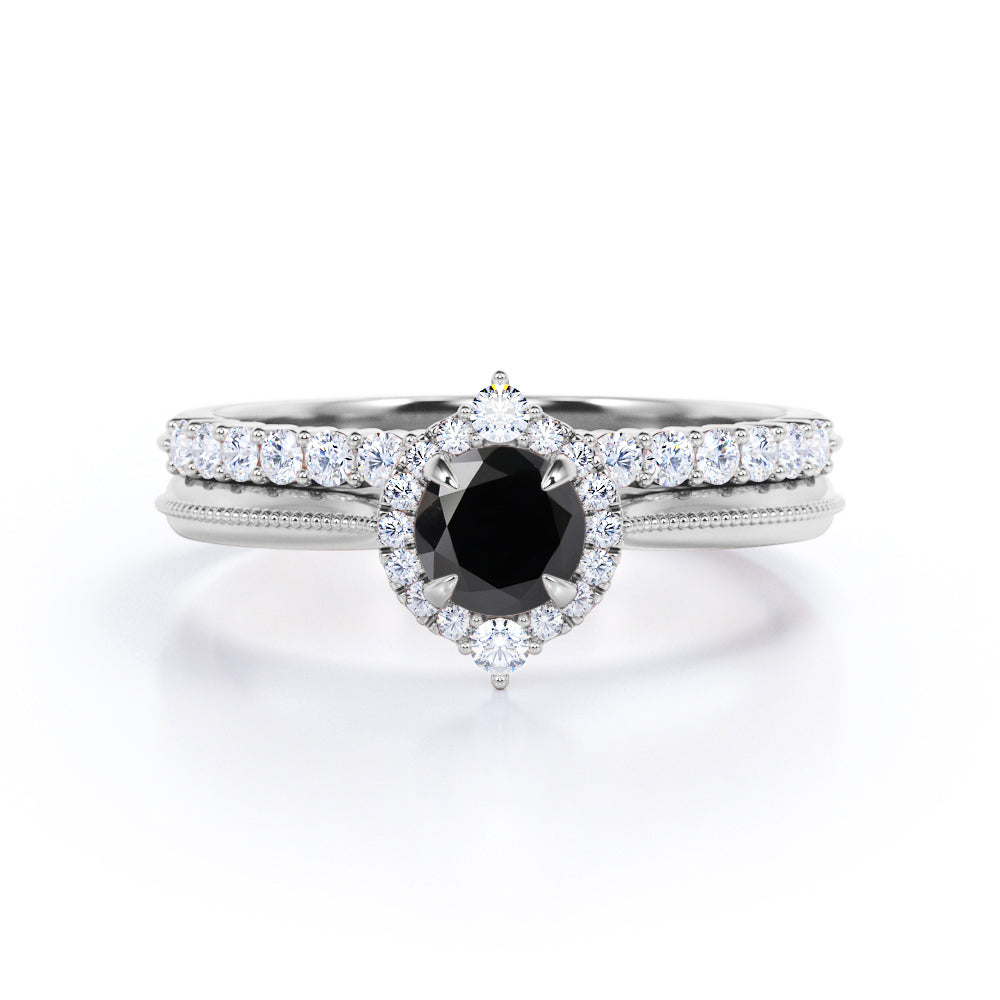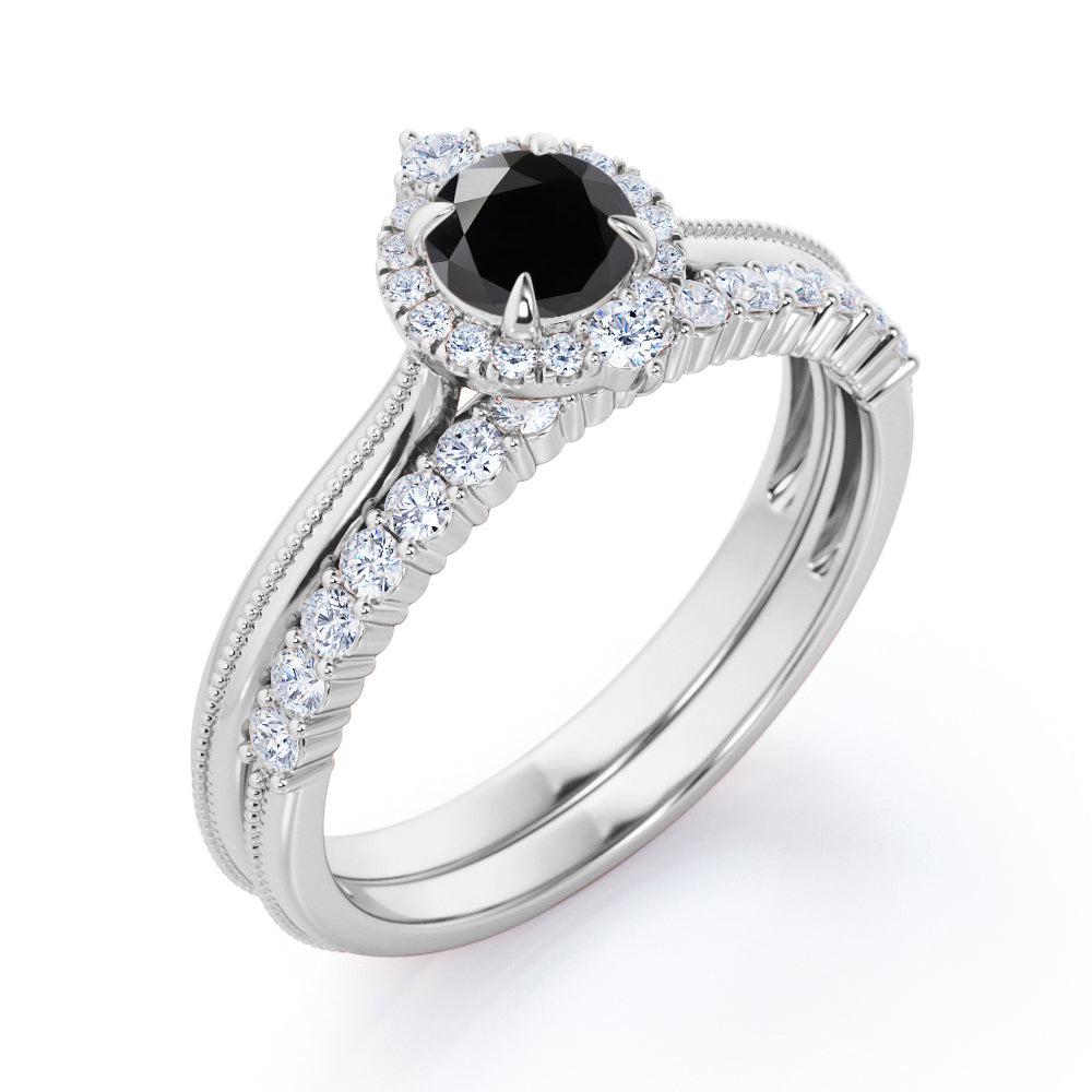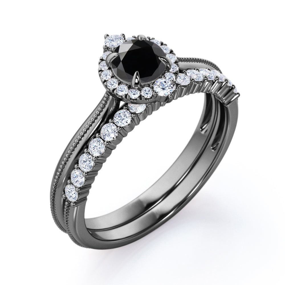1.25 carat round cut Black Diamond filigree bridal set in white gold. Glow up in our classic Black Diamond bridal set made in real white gold. The bridal set comprises of one engagement ring and a matching wedding band. The engagement ring consists of 1 carat Black Diamond and surrounded by sizzling .25 carat of diamonds. Complete your vows with this vintage style ring and make your love story as antique as this wedding ring set is. The vintage filigree style adds a certain loveliness to the ring. Choosing the right wedding ring is very important as it will express your love and stir feelings of joy that will be unforgettable. This 1.25 carat round cut Black Diamond filigree bridal set in white gold can also be customized to 10k Gold, 14k Gold.