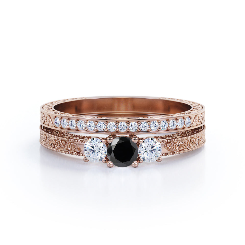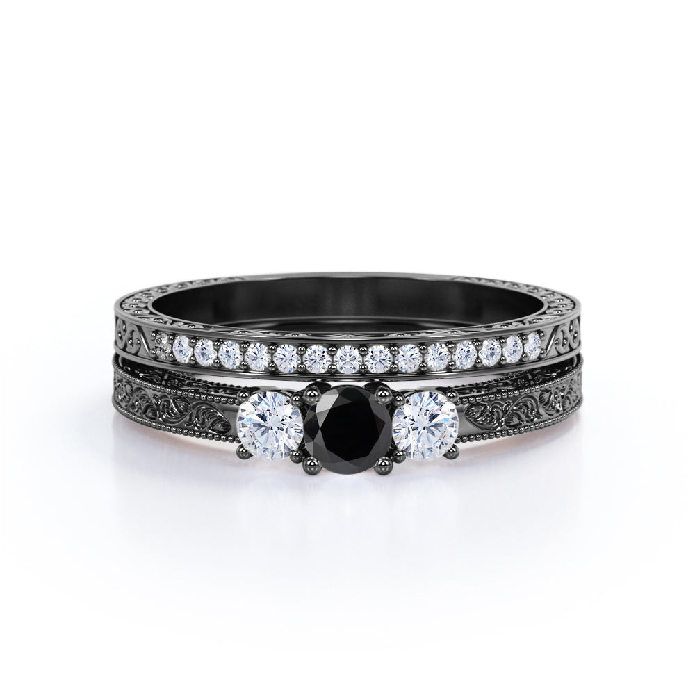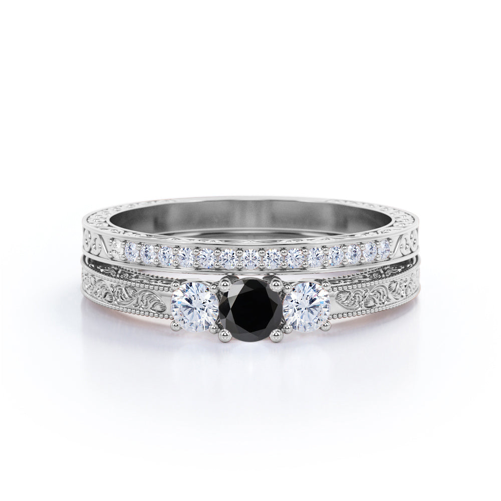 1.25 carat round cut Black Diamond three stone wedding ring set in white gold. Seal her hearts forever with our exquisite Black Diamond wedding ring set in white gold. This round cut three stone engagement ring comes with a matching wedding band that will make her yours for lifetime. Complete your vows with this art deco style ring and make your love story as antique as this wedding ring set is. The vintage milgrain style adds a certain loveliness to the ring. Choosing the right wedding ring is very important as it will express your love and stir feelings of joy that will be unforgettable. Choose this Black Diamond wedding ring set and enter into a new journey of your life. This 1.25 carat round cut Black Diamond three stone wedding ring set in white gold can also be customized to 10k Gold, 14k Gold.