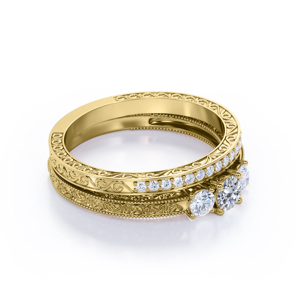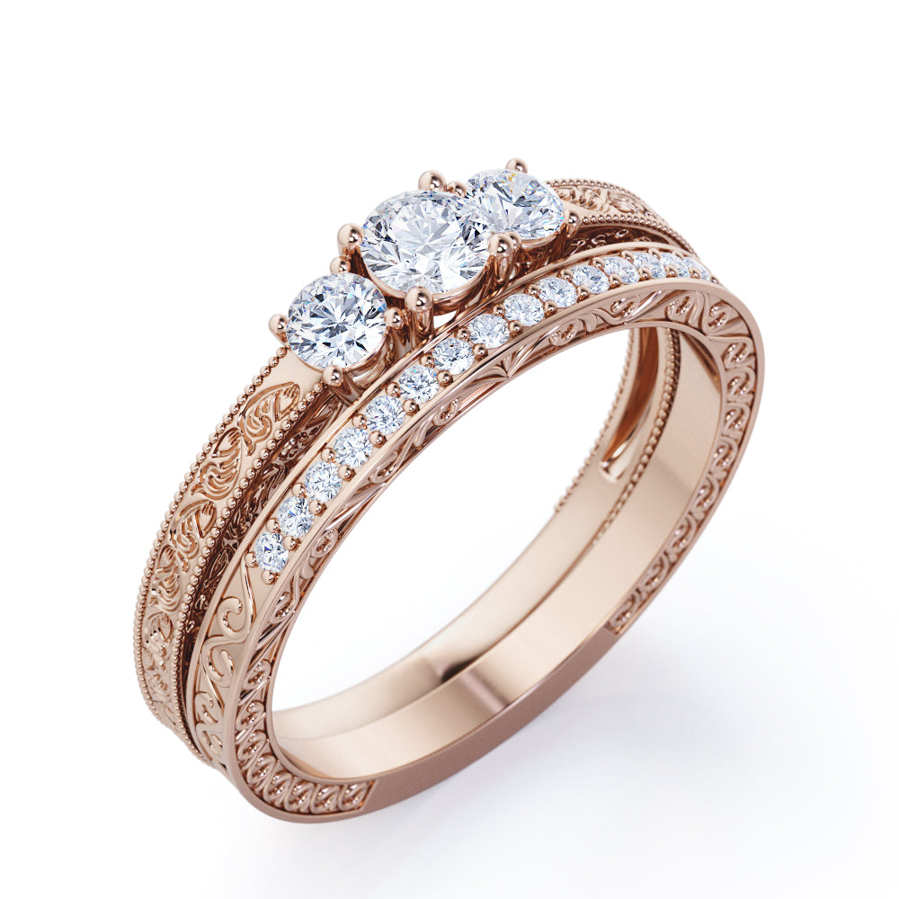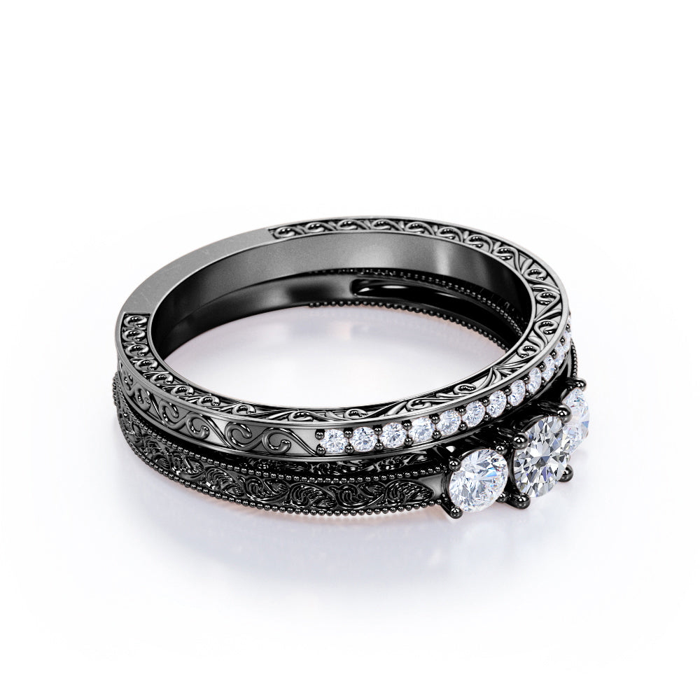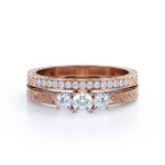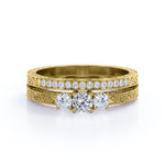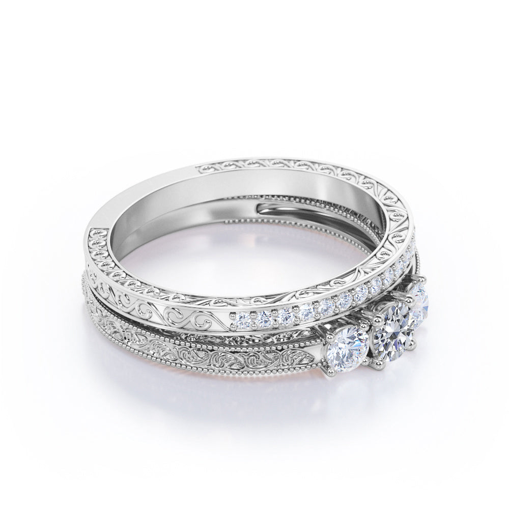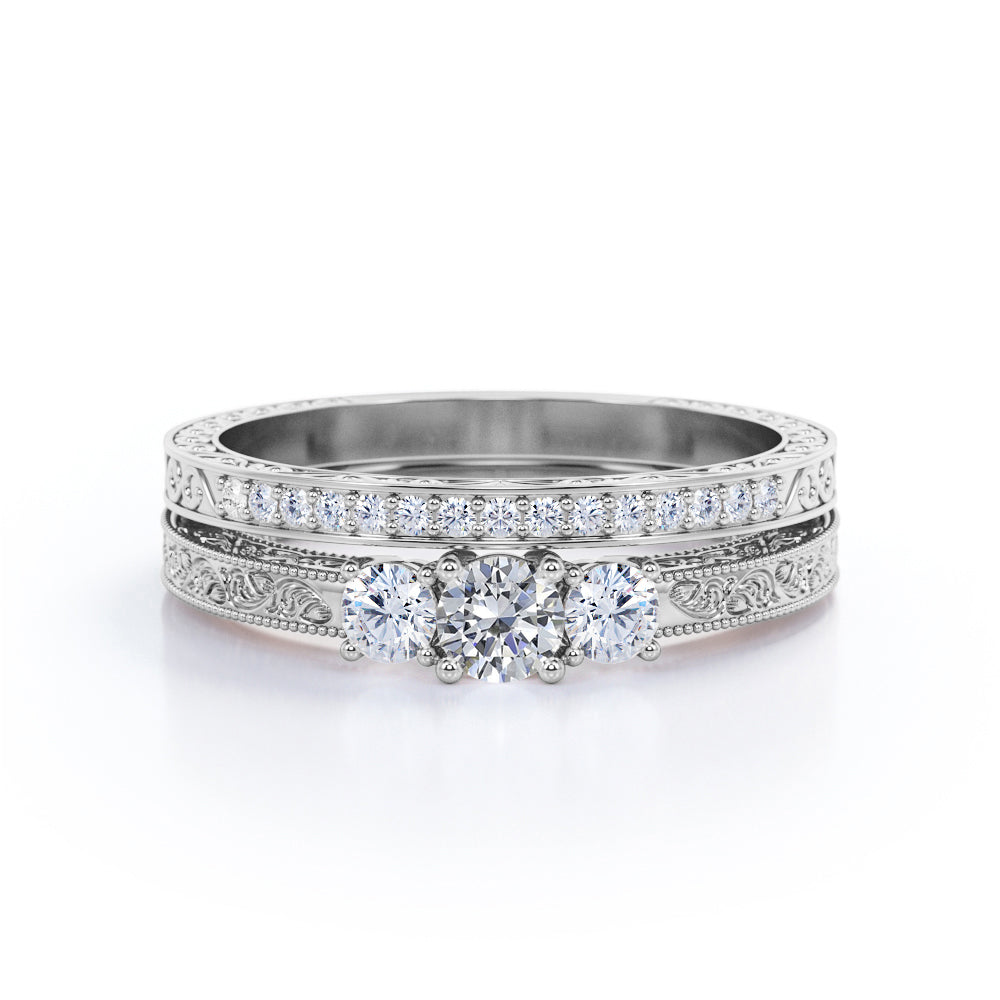1.25 carat round cut near colorless Moissanite three stone wedding ring set in white gold. Seal her hearts forever with our exquisite Moissanite wedding ring set in white gold. This round cut three stone engagement ring comes with a matching wedding band that will make her yours for lifetime. Complete your vows with this art deco style ring and make your love story as antique as this wedding ring set is. The vintage milgrain style adds a certain loveliness to the ring. Choosing the right wedding ring is very important as it will express your love and stir feelings of joy that will be unforgettable. Choose this Moissanite wedding ring set and enter into a new journey of your life. This 1.25 carat round cut near colorless Moissanite and diamond three stone wedding ring set in white gold can also be customized to 18k Gold plating over silver, 10k Gold, 14k Gold or 18k Gold.