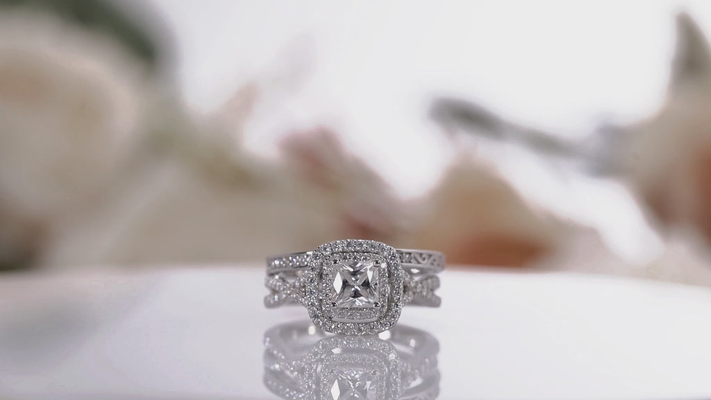 Celebrate your timeless love with our Double Halo 1 ct TDW Princess Cut Infinity Certified Lab Diamond Bridal Set in White Gold. Featuring a 0.33 carat center Certified Lab Diamond and 0.67 carats of side Moissanites, this stunning piece is perfect for engagements, anniversaries, or promises. Its vintage-inspired design complements any style and can be paired with other jewelry. Each handmade piece is crafted by skilled artisans. Enjoy a 30-day free resizing, full refund policy, and a 6-month limited warranty from delivery.