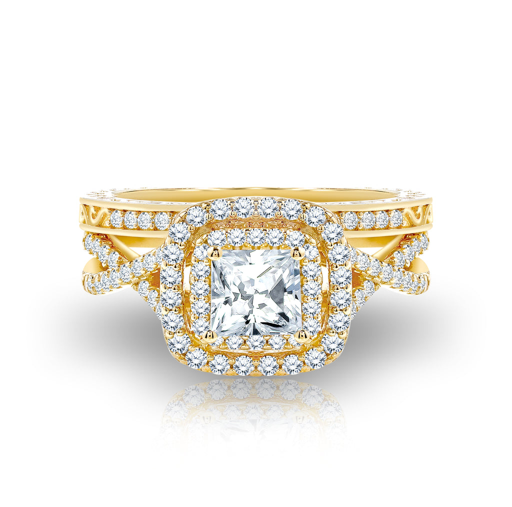 1.75 ct - Square Moissanite - Double Halo - Twisted Band - Vintage Inspired - Pave - Wedding Ring Set in 18K Yellow Gold over Silver