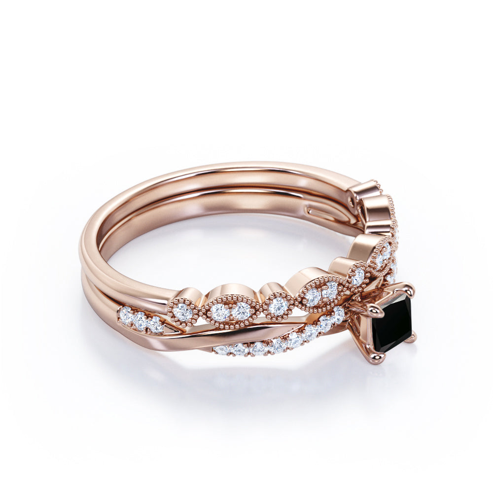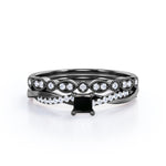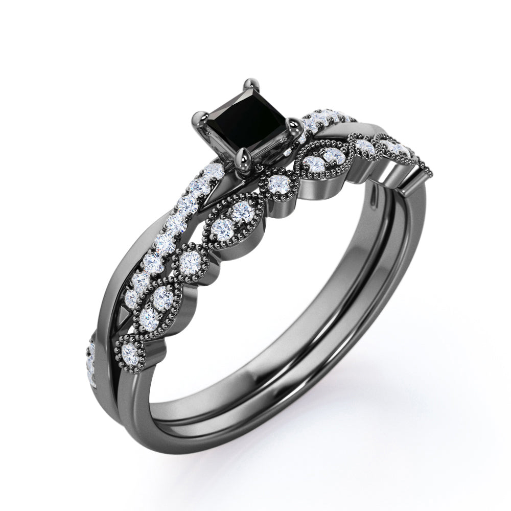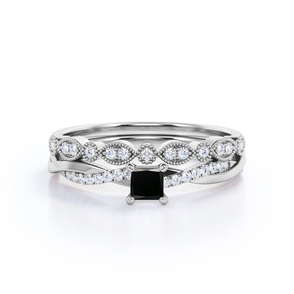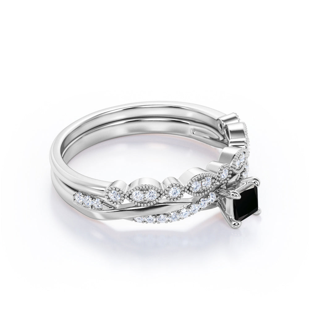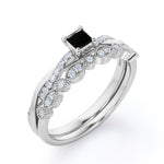 1.3 carat princess cut Lab Grown Black Diamond four prong infinity bridal set in white gold. Can’t take off your eyes from this divine wedding ring set? Make it all yours by purchasing our princess cut Lab Grown Black Diamond infinity bridal set in white gold. This princess cut ring features 1 carat Lab Grown Black Diamond at the center and is surrounded by 0.3 carat of side diamonds inclusive of the matching wedding band. This infinity ring will add a touch of sophistication in your ensemble. The pave set Lab Grown Black Diamonds in this ring radiates strong brilliance and they will look fabulous in your fingers for years to come. This 1.3 carat princess cut Lab Grown Black Diamond four prong infinity bridal set in white gold can also be customized to 10k Gold, 14k Gold depending upon your choice.