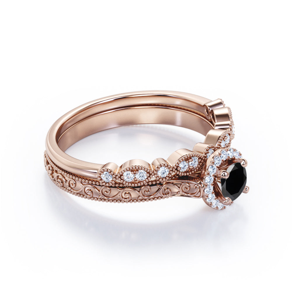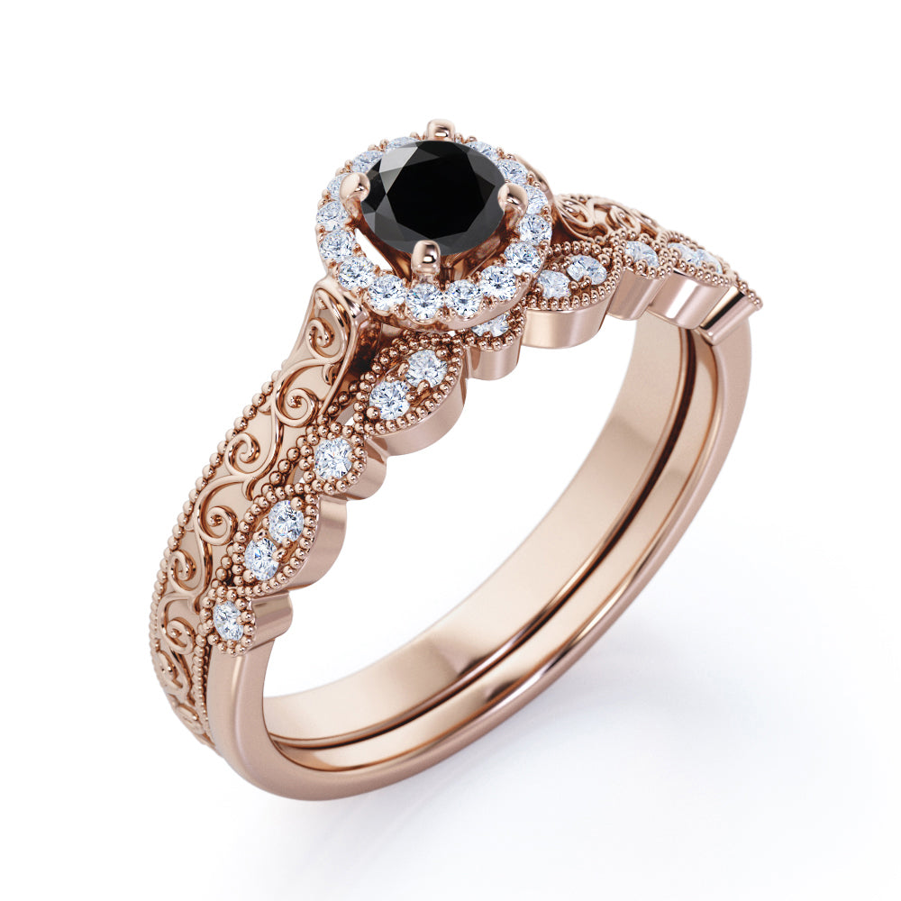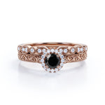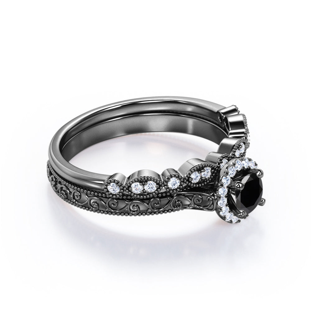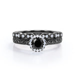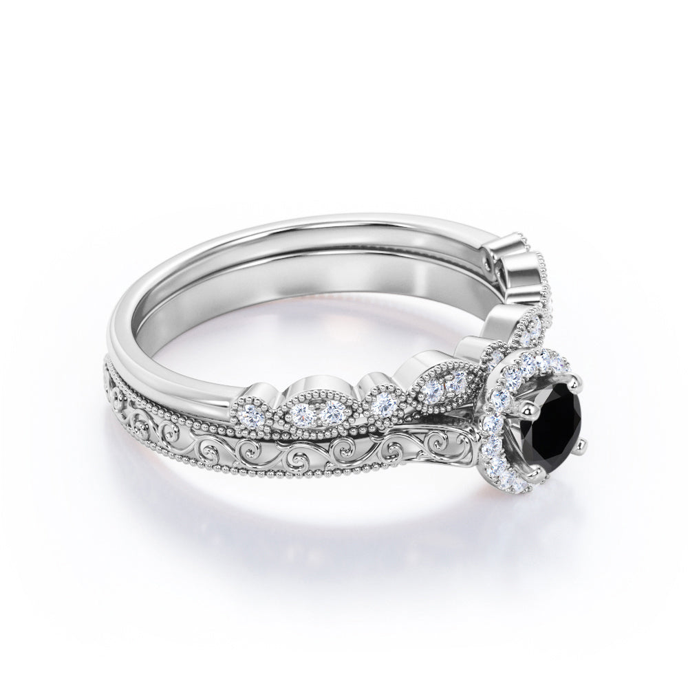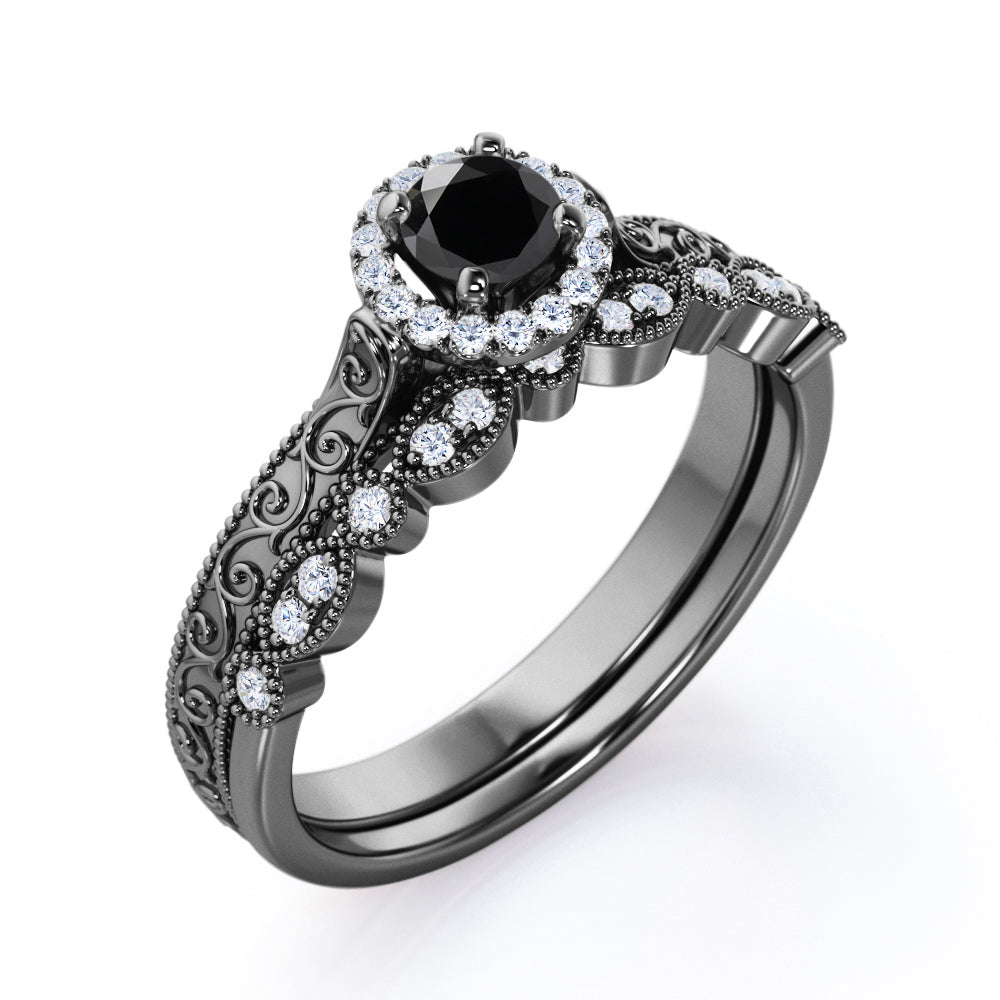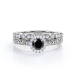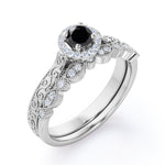 1.3 carat round cut Lab Grown Black Diamond halo wedding ring set in white gold. Enhance your appeal and aura with our divine real Lab Grown Black Diamond wedding ring set in white gold. This eye-pleasing round cut wedding ring set comprises of an engagement ring along with a matching wedding band with total weight of 1.3 carat. The graceful pattern of our modern art deco ring is a subtle reminder of our good old workmanship. This halo wedding set in white gold can also be customized to 10k Gold, 14k Gold as per your preference. With this magnificent Lab Grown Black Diamond ring that you may personalize to your liking, you can create your own fantastic style.Grab this now or worry later.