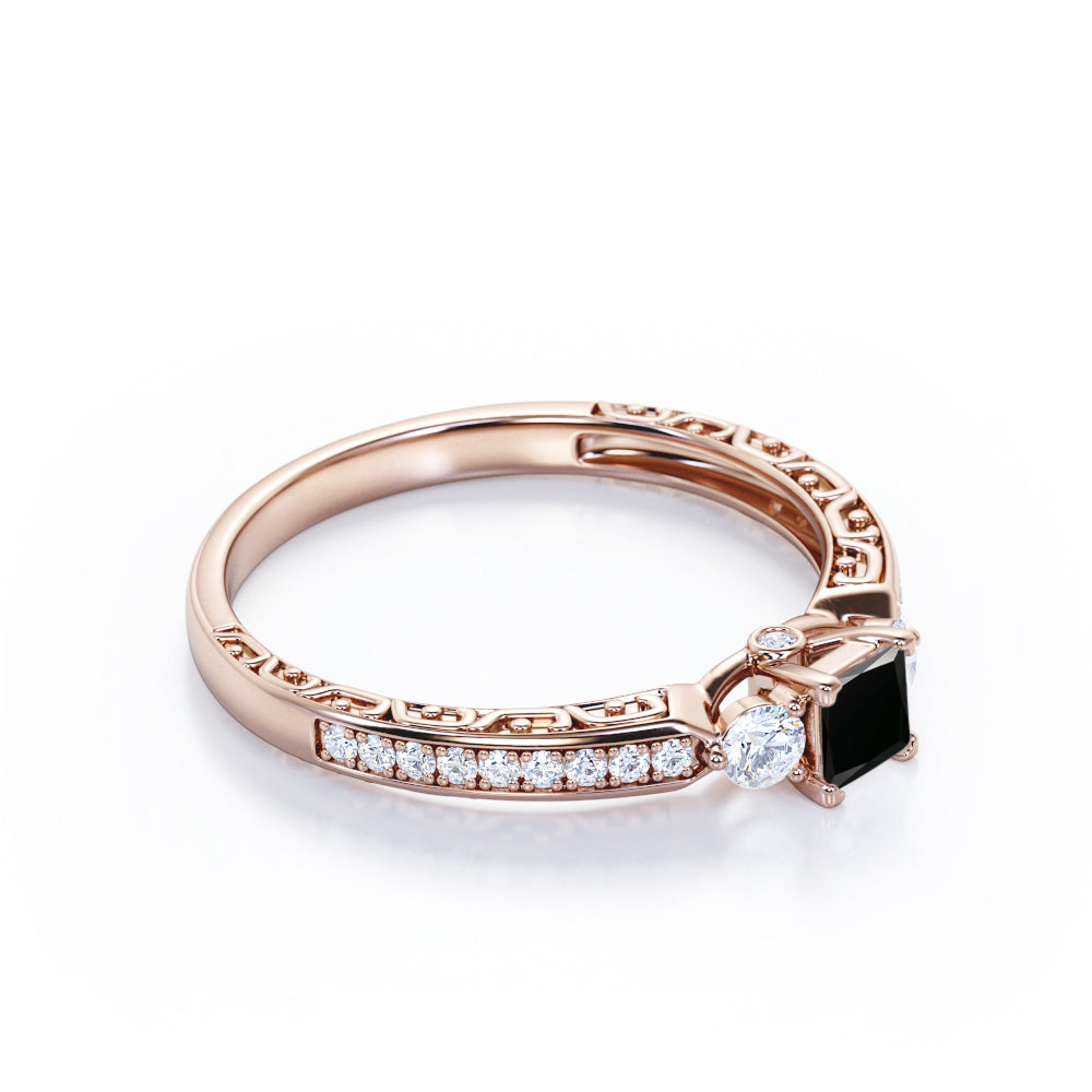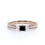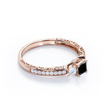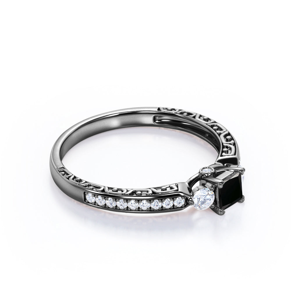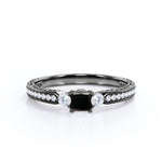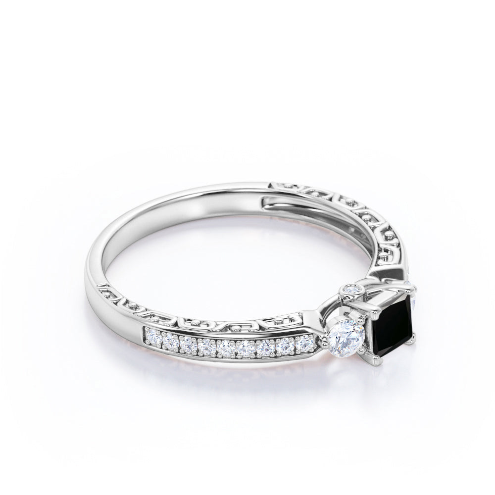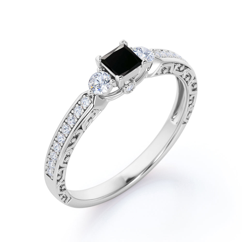 1.35 carat princess cut Lab Grown Black Diamond 3 stone vintage engagement ring in white gold. Looking for something different and classic with a vintage touch? Then look no more, presenting our distinctive genuine Lab Grown Black Diamond three stone vintage engagement ring. This princess cut exclusive Lab Grown Black Diamond ring is perfect for those who enjoy traditional, antique, and vintage styles of jewelry. This three stone Lab Grown Black Diamond ring may be the ideal gift for anniversary, or promise ring for women. This exquisite Lab Grown Black Diamond ring is a timeless addition to any woman's jewelry collection. It features a magnificent 1 carat genuine real Lab Grown Black Diamond as the center stone. A delicate mix of glittering diamond side stones with a total weight of 0.35 carats adds more value to its charm. This 1.35 carat princess cut Lab Grown Black Diamond three stone vintage style engagement ring in white gold can also be customized to 10k Gold, 14k Gold as per your choice.