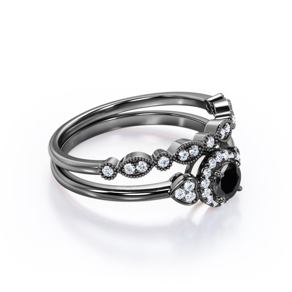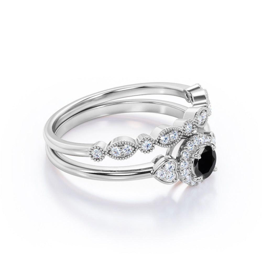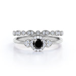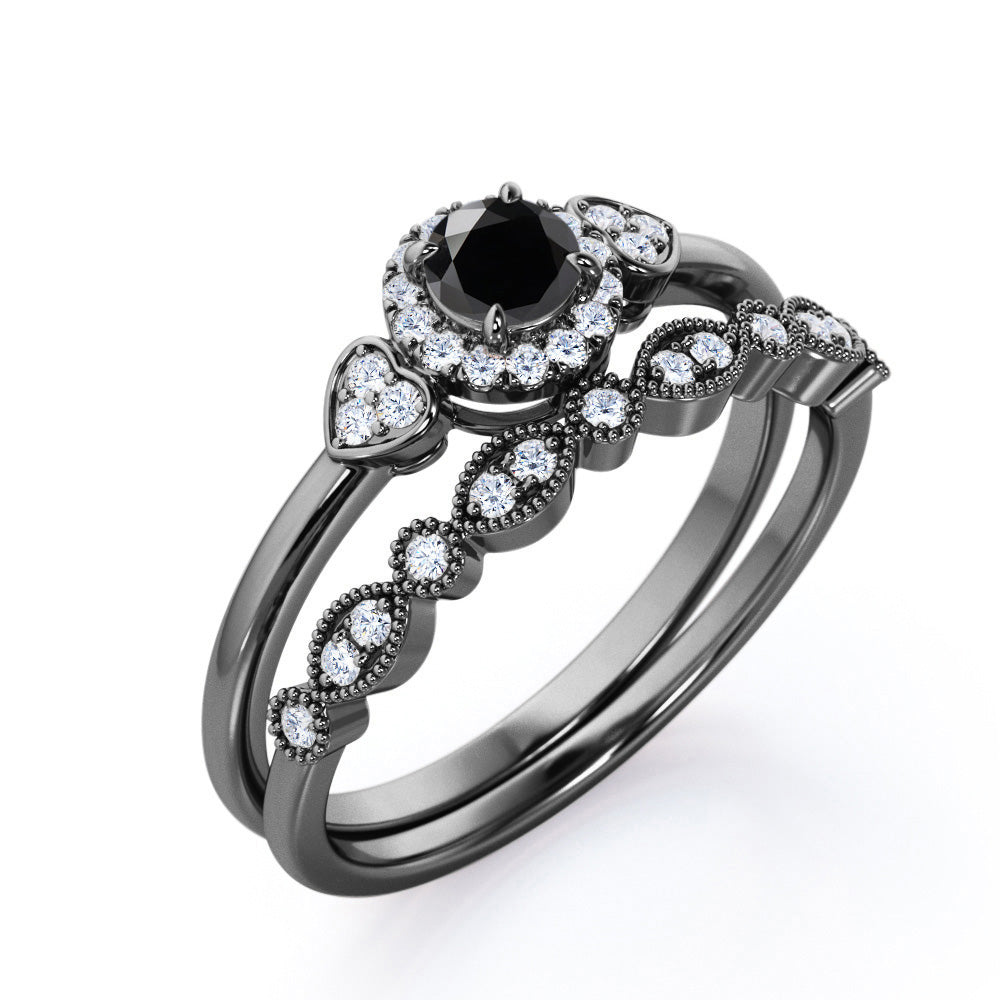 1.35 carat round cut Lab Grown Black Diamond halo wedding ring set in white gold. Complete your vows with this majestic Lab Grown Black Diamond ring and make your love story unique as this wedding ring set is. This halo wedding ring set might be the beginning of something very special. Handcrafted with great devotion, this round cut Lab Grown Black Diamond wedding ring will keep all your wonderful memories alive in your fingers. The wedding set includes an engagement ring with 1 carat Lab Grown Black Diamond at the center and is surrounded by 0.35 carat of sparkling diamonds. This 1.35 carat round cut Lab Grown Black Diamond halo wedding ring set in white gold can also be customized to 10k Gold, 14k Gold .