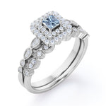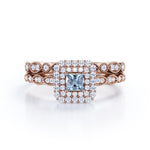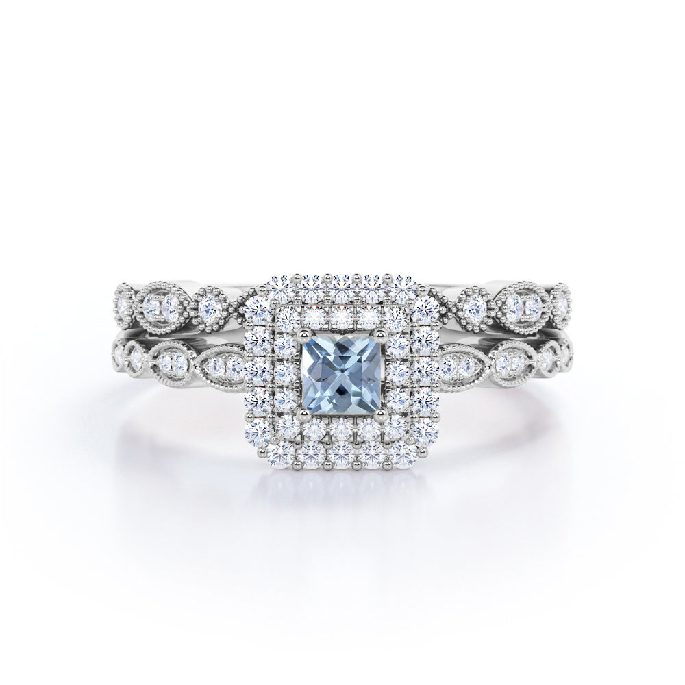 1.45 Carat Princess Cut Aquamarine And Diamond Cluster Wedding Ring Set In White Gold. Fascinate her heart with the never-ending shine of this cluster bridal set. A very fine blue aquamarine center stone is surrounded by paved dazzling diamonds set in a cluster setting that shines magnificently. The engagement ring band and the matching wedding band of this set feature an art-deco design with intricate milgrain details beautifully handcrafted by our talented and experienced jewelers. Handcrafted with passion, this nature-inspired double-halo bridal set is made with 1 carat very fine princess-cut aquamarine center stone, surrounded by, 0.45 carat dazzling diamond side stones for the gold rings and moissanite for the silver rings that weigh a total of 1.5 carat. Magnificent in white gold, this striking wedding ring set is also available in rose gold, yellow gold, and black gold. Also, it can be made between 18k gold over silver, 10k gold, and 14k gold depending on your preferred customization. Please kindly note for the silver ring option that silver is a very sensitive metal, any chemicals like hand creams, lotion, or sanitizers. etc., can affect the plating.