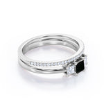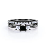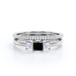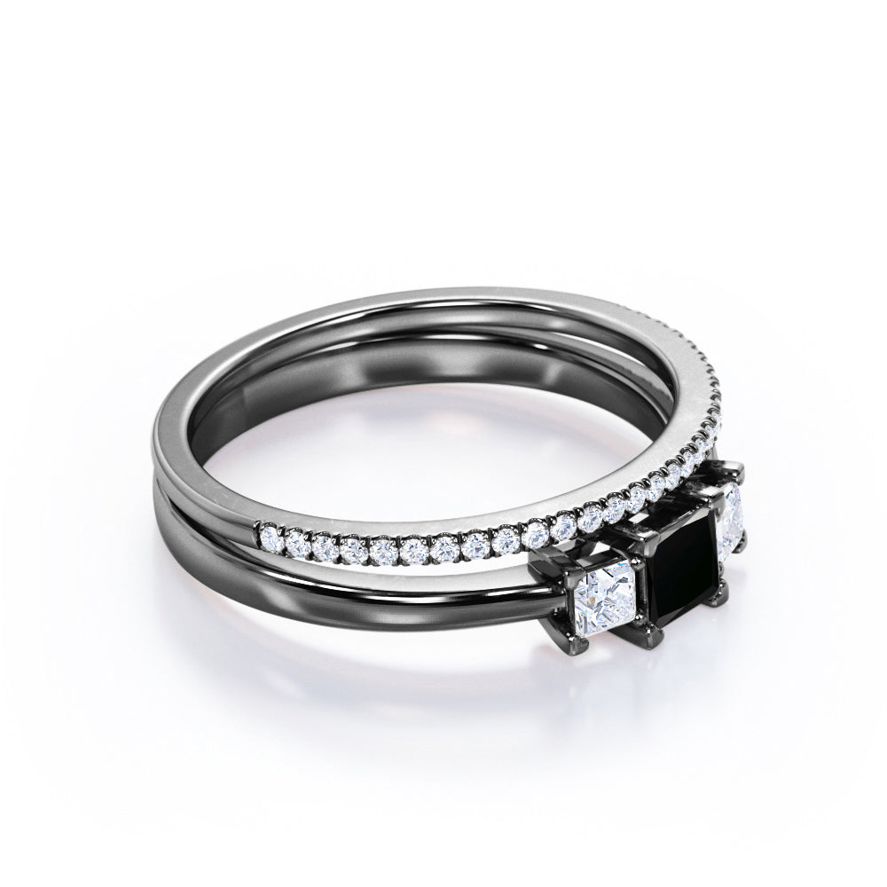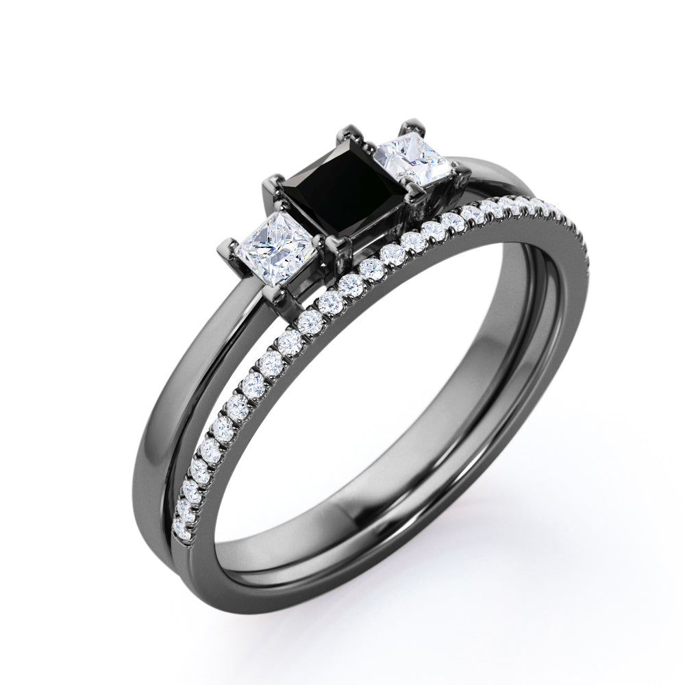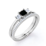 1.45 carat princess cut Lab Grown Black Diamond trilogy wedding ring set in white gold. If you are looking for the perfect representation of love and commitment, then look no more; this intriguing Lab Grown Black Diamond wedding ring set is exactly the one for you. Elegantly designed by our well-experienced craftsmen, this Lab Grown Black Diamond wedding set features 1 carat lab created Black diamond center stone and two princess-cut side diamonds and a matching wedding band covered with pave set glistening diamonds. The three stone in the ring represents the present past and future of a couple. This trilogy Lab Grown Black Diamond wedding ring set will absolutely complement your ensemble and add that extra touch to your look. This 1.45 carat princess cut Lab Grown Black Diamond wedding set in white gold can also be customized to 10k Gold, 14k Gold .
