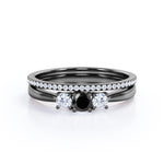 1.45 Carat Round Cut Lab Grown Black Diamond Three Stone Wedding Ring Set In White Gold