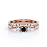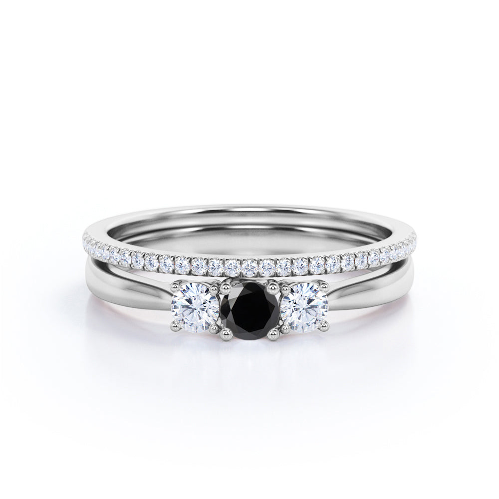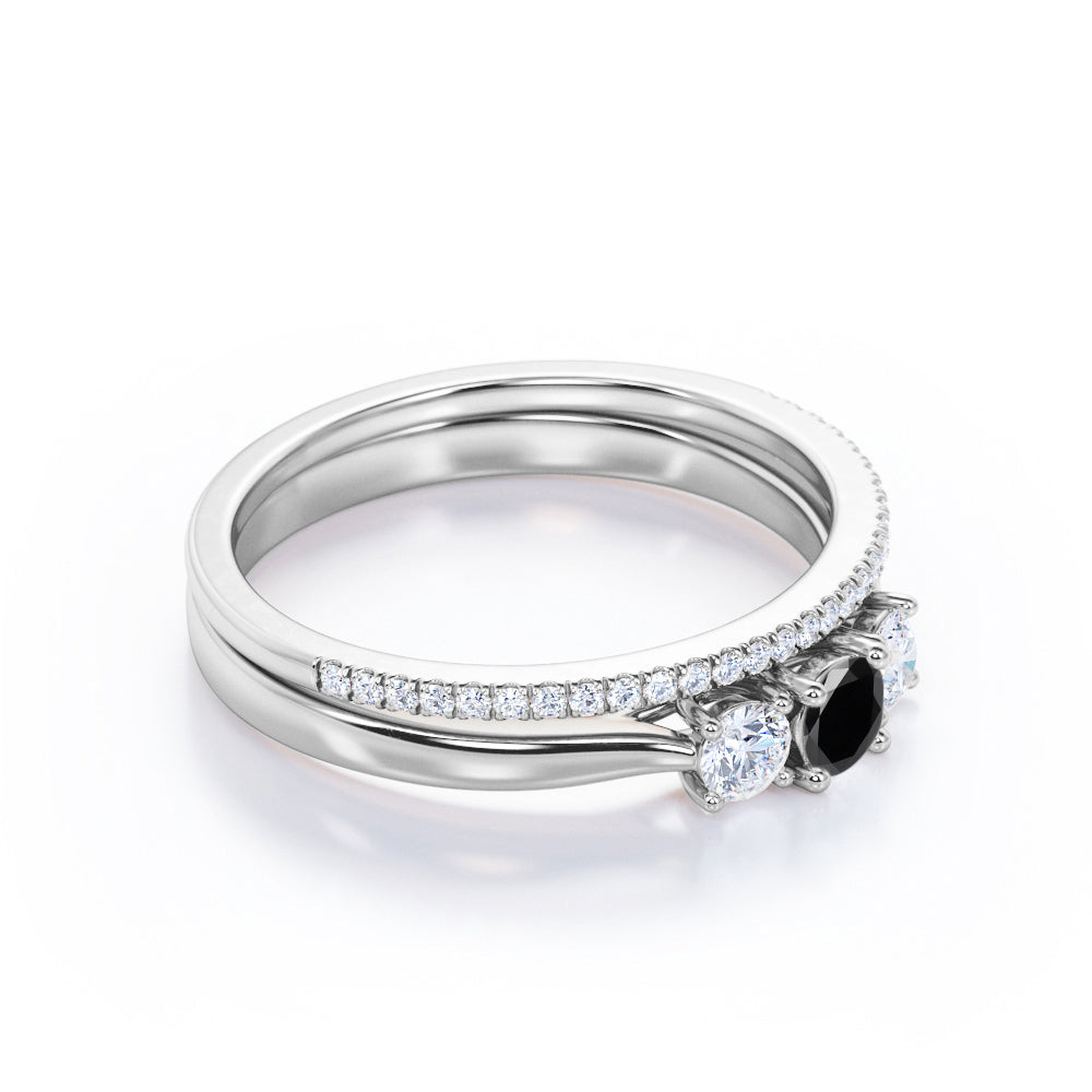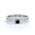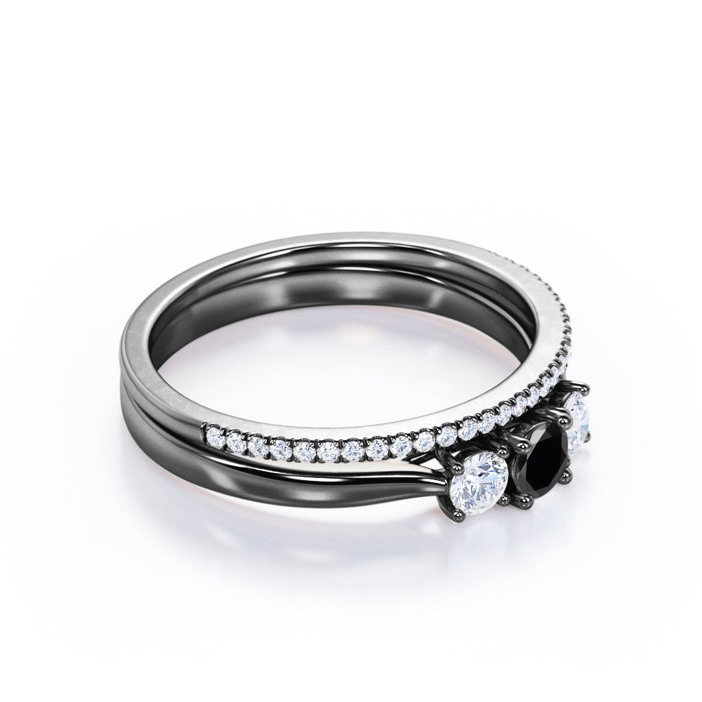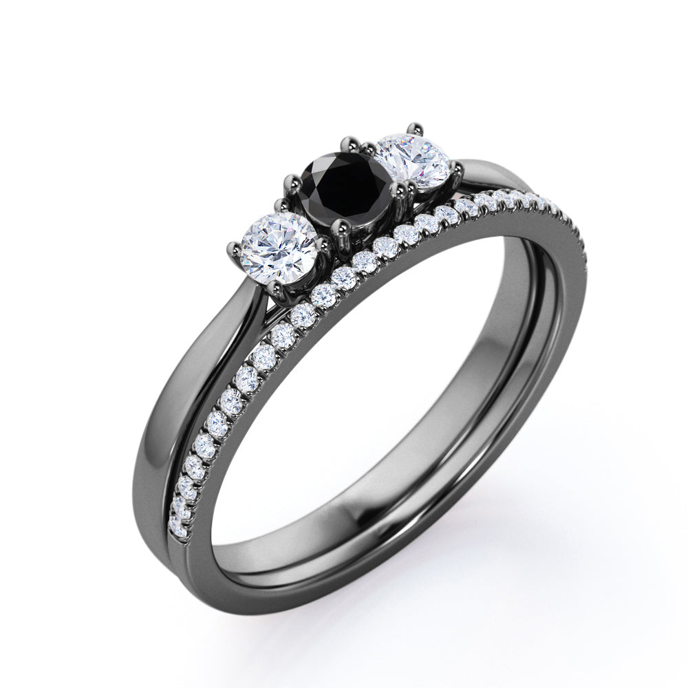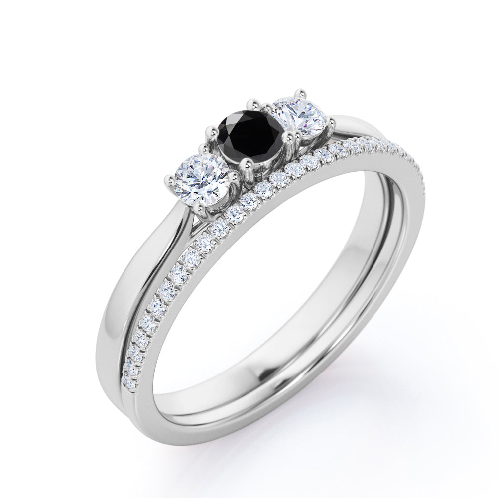 1.45 carat round cut Lab Grown Black Diamond three stone wedding ring set in white gold. Seal her hearts forever with our exquisite Lab Grown Black Diamond wedding ring set in white gold. This round cut three stone engagement ring comes with a matching wedding band that will make her yours for lifetime. The pave set ring illuminates a brilliant brilliance which will add that extra glow on your fingers on your big day. Choosing the right wedding ring is very important as it will express your love and stir feelings of joy that will be unforgettable. This 1.45 carat round cut Lab Grown Black Diamond three stone wedding ring set in white gold can also be customized to 10k Gold, 14k Gold as per your desire.