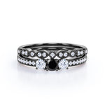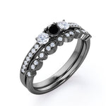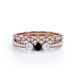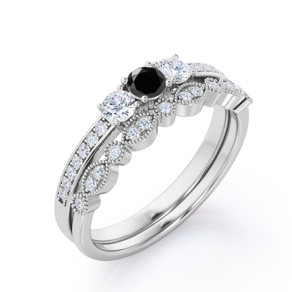 1.45 carat round cut Lab Grown Black Diamond trilogy wedding ring set in white gold. Sometimes feelings can be difficult to put into words, but the ideal wedding ring can speak for you since it will evoke feelings of delight that will last for a lifetime. This trilogy wedding set includes an engagement ring and a matching wedding band. The round cut three stone ring offers a very unique look. The antique design adds subtle grace to this wedding set. If you want to stand out in room of plenty people, this ring will do all the wonders. Grab it before it runs out of stock. This 1.45 carat round cut Lab Grown Black Diamond trilogy wedding ring set in white gold can also be customized to 10k Gold, 14k Gold .