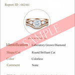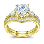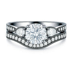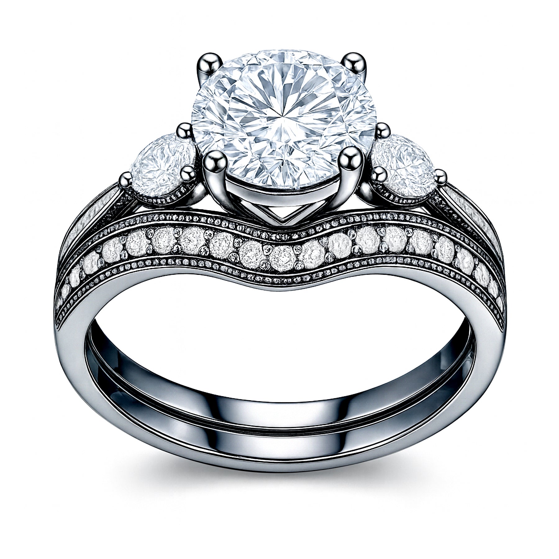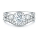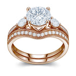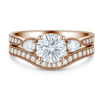Bold and breathtaking, this bridal set features a dazzling 1carat Certified round Lab Diamond center stone flanked by elegant pear-shaped Moissanite side stones, set in a vintage-inspired rose gold band. The matching wedding band is encrusted with a continuous row of sparkling stones, outlined by delicate milgrain details for added charm. This set is perfect for the bride who wants maximum sparkle with heirloom elegance.
