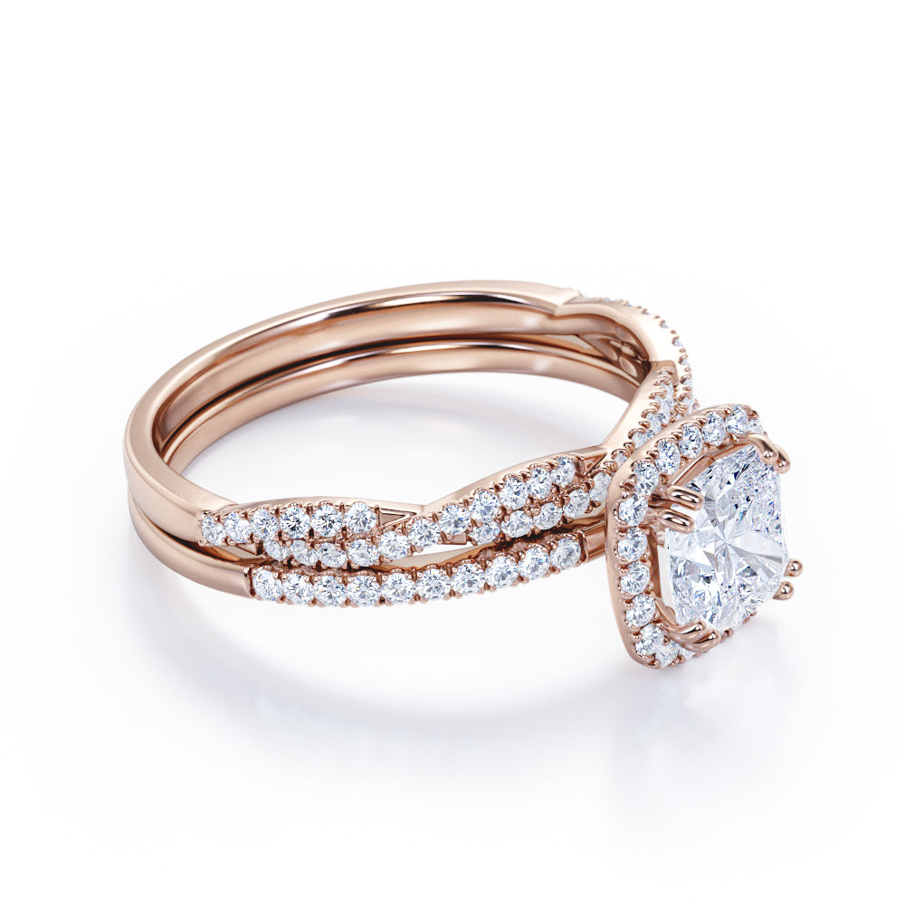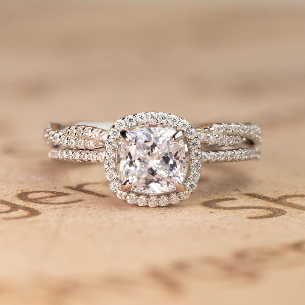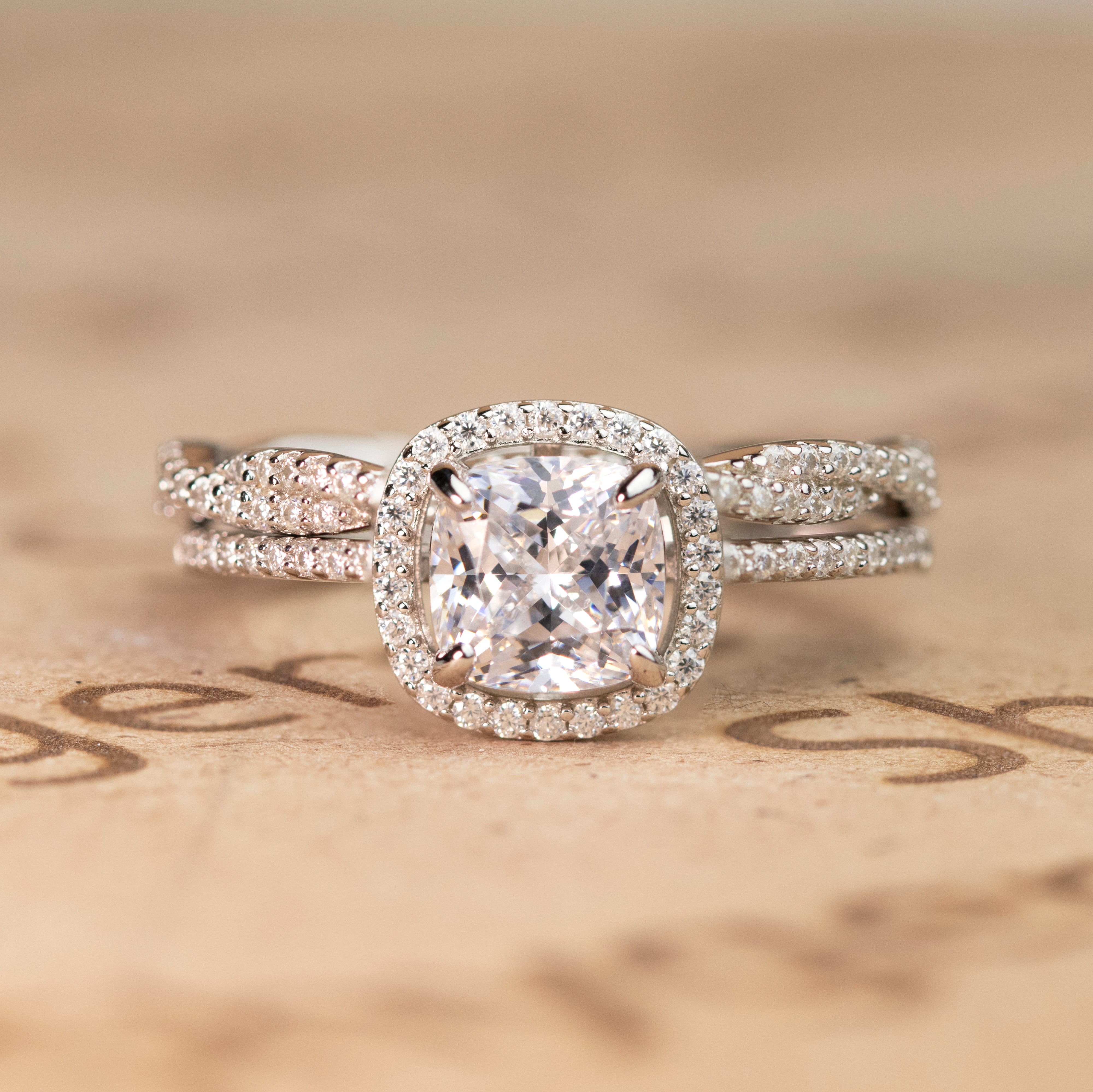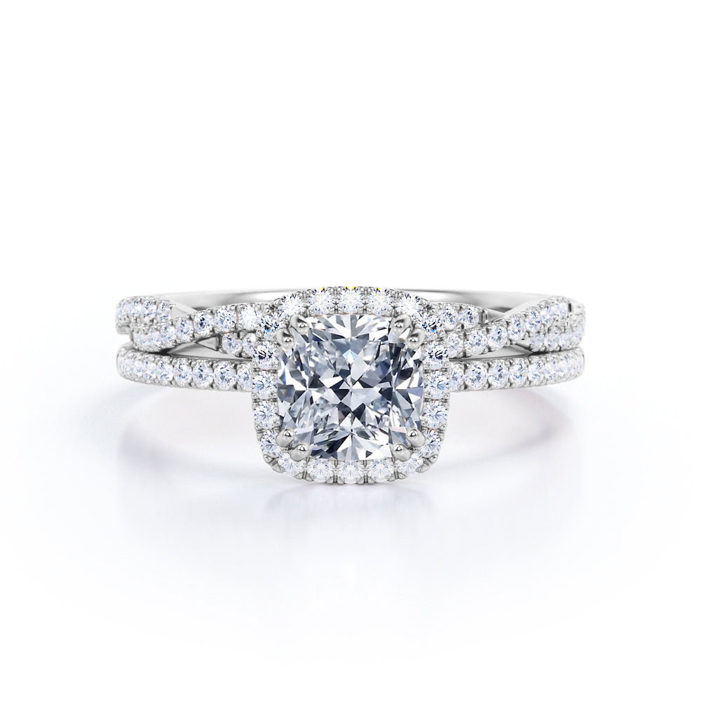 1.5 carat cushion cut Moissanite and diamond halo bridal set in white gold. Everything you expect in a precious jewelry, our Moissanite and diamond bridal set is the perfect example for it. This charming ring in cushion cut comprises of 1 carat Moissanite and 0.5 carat of diamonds inclusive of the twinning wedding band. This halo bridal set will definitely make you the center of attraction wherever you go. The infinity ring is a trending style which gives you a stylish look. The pave set diamonds in this wedding set which exhibits strong brilliance will add that extra glam to your style. This 1.5 carat cushion cut Moissanite and diamond halo bridal set in white gold can also be customized to 18k Gold plating over silver, 10k Gold, 14k Gold or 18k Gold.