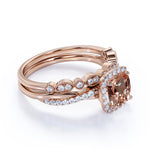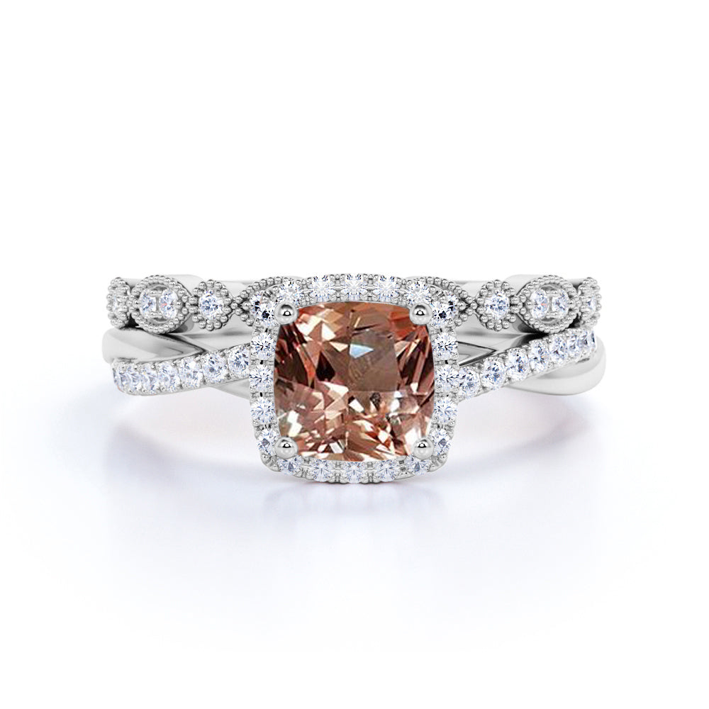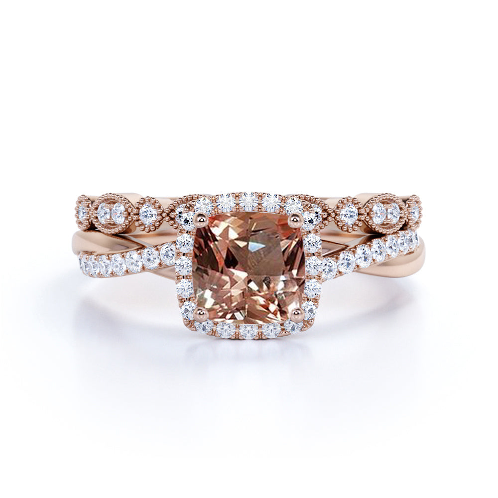 1.5 Carat Cushion Cut Peach Morganite and Diamond Wedding Ring Set in 10k Rose Gold Celebrity Ring