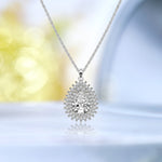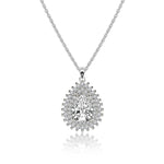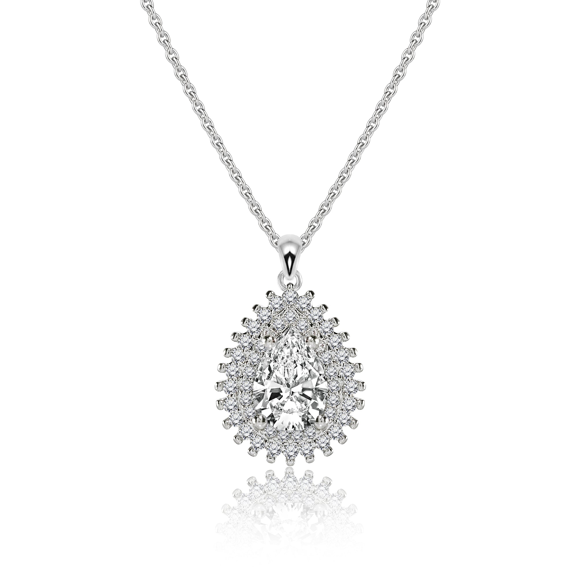 Unveil the captivating beauty of our 1.5 Carat Double Halo Pear Shaped Pendant Necklace. At the heart of this large teardrop pendant necklace lies a resplendent pear-shaped gemstone, embraced by not one, but two radiant halos. The double halo pendant transforms this piece into a captivating cluster of brilliance, making it the centerpiece of any ensemble. Together with the center stone, this women's teardrop necklace features a total carat weight of 1.5 carats. The cluster pendant necklace design adds a touch of sophistication, while the meticulous craftsmanship ensures every facet gleams with unrivaled luminosity. The luxury affordable jewelry setting perfectly showcases the gemstone's intricate beauty that can accompany you on many occasions.