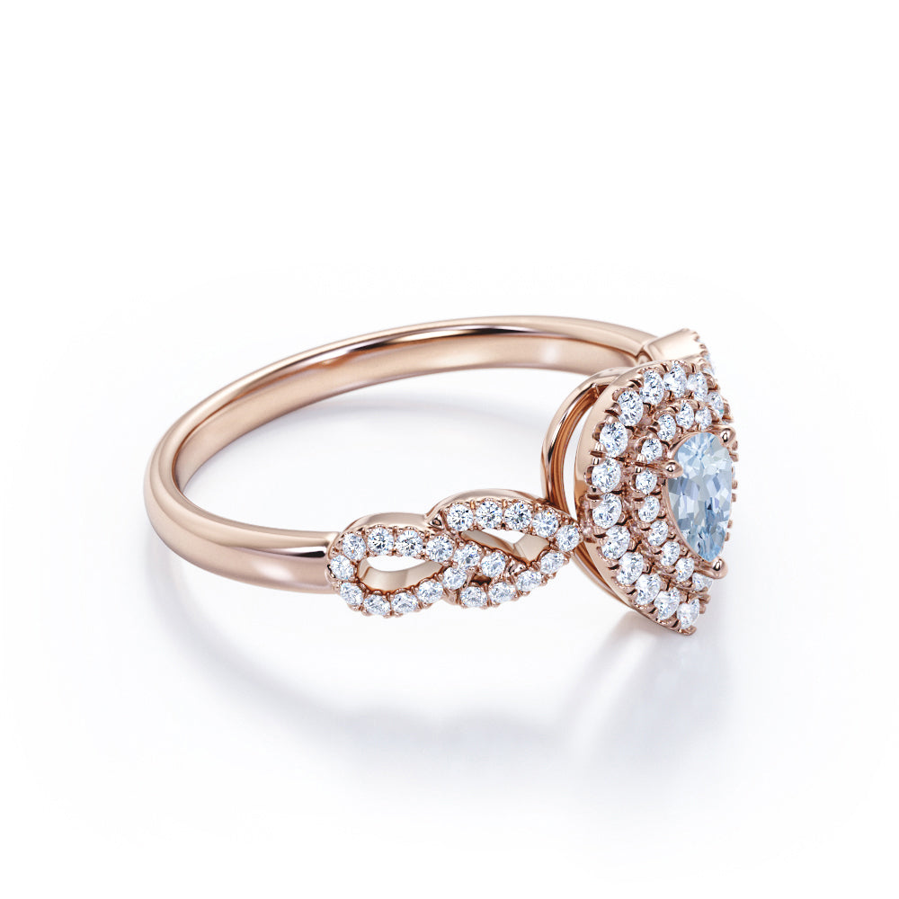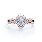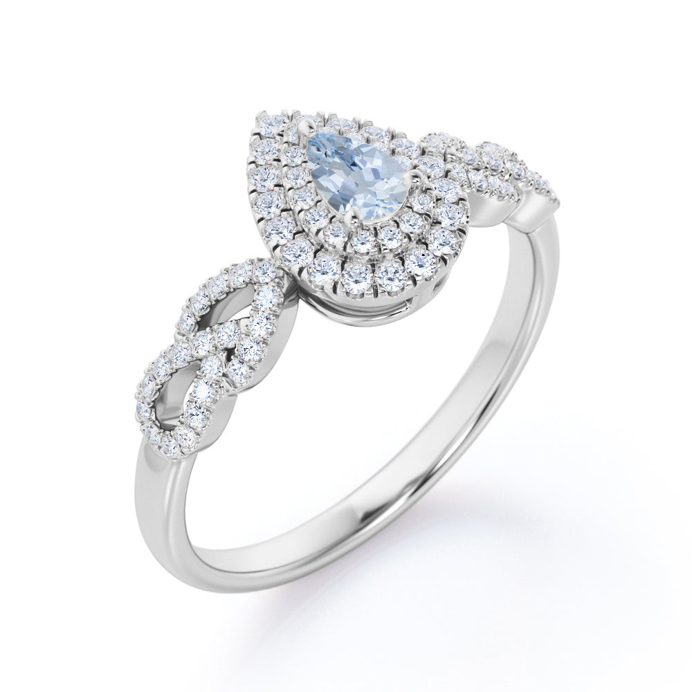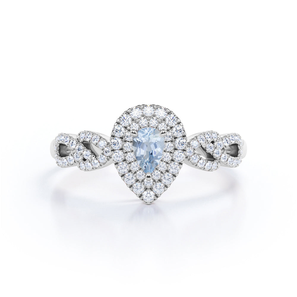 1.5 Carat Pear Cut Aquamarine And Diamond Double Halo Engagement Ring In White Gold. Make a bold statement with this lustrous double halo engagement ring. A dazzling blue aquamarine center stone is clustered by paved diamond side stones that sparkle brilliantly while paved diamonds are also settled in the twisted band that adds extra sparkle to the ring. This lavish promise ring will definitely stand out from the crowd and is a perfect choice for those who are all about sparkle and shine. Handcrafted with passion, this infinity ring is made with 1 carat very fine pear-cut aquamarine center stone, surrounded by 0.5 carat dazzling round diamond side stones for the gold rings and moissanite for the silver rings that weigh a total of 1.5 carat. Undeniably luxurious in white gold, this fancy promise ring is also available in rose gold, yellow gold, and black gold. Also, it can be made between 18k gold over silver, 10k gold, and 14k gold depending on your preferred customization. Please kindly note for the silver ring option that silver is a very sensitive metal, any chemicals like hand creams, lotion, or sanitizers. etc., can affect the plating.