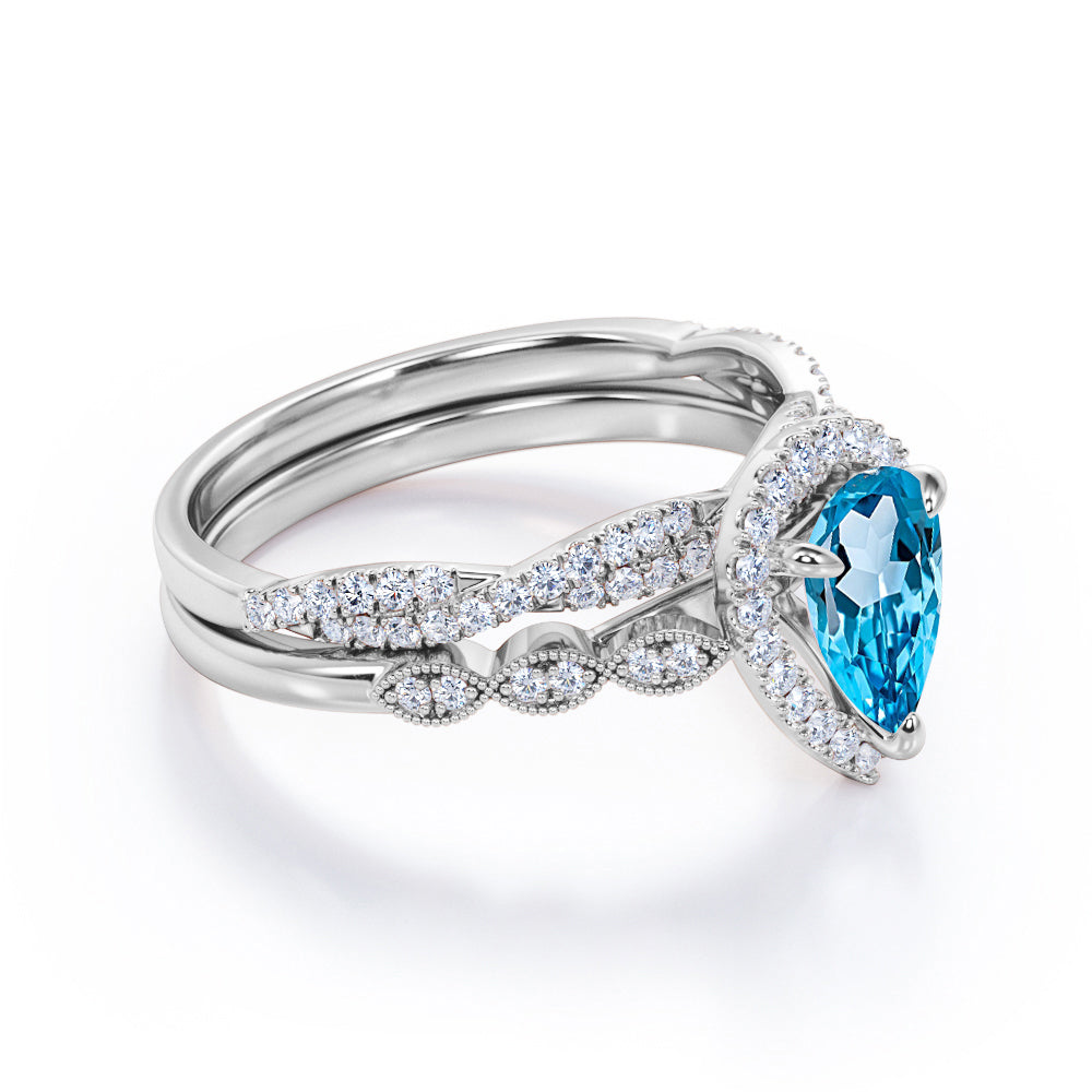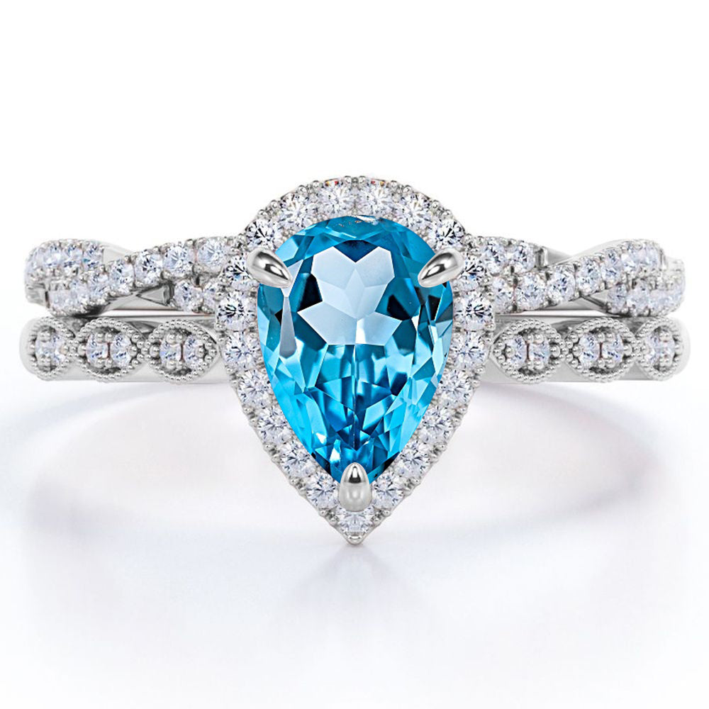 Be trendy with this 1.5 Carat Pear Cut December Birthstone Blue Topaz and Moissanite Vintage Engagement Ring - Halo Pave Bridal Set in 18K White Gold Over Silver. You can mix and match this vintage inspired ring with your other jewelry accessories. Blue topaz is a popular variety of topaz for engagement rings, perhaps because of its lovely meaning. Blue topaz is said to be a stone of love and good fortune, and is also said to promote positive communication, openness, and honesty. Profess your love with this magnificent Blue Topaz wedding ring set which is said to symbolize fidelity, creativity and confidence. This delicate bridal set is adorned with 1 carat Blue Topaz center stone. It is surrounded by 0.50 carat of round brilliant cut moissanite that can be a perfect alternative to diamonds as moissanite have almost the same durability and quality as diamonds that will last for a lifetime along its sides and matching band as the perfect sparkling finishing touch to this splendorous wedding ring set. Symbolize your passion with this Blue Topaz ring that is as unique as your love story or simply make a loved one smile with this delicate everlasting piece. Each of our handmade rings are meticulously crafted by our passionate artisans and as your satisfaction is our priority, we deliver the order to customers with elegant jewelry box. Let's make her day with our 1.5 Carat Pear Cut December Birthstone Blue Topaz and Moissanite Vintage Engagement Ring - Halo Pave Bridal Set in 18K White Gold Over Silver.Total Carat Weight (All Stones): 1.5 Carats|Main Gemstone Type: Cubic Zirconia|Main Gemstone Color: Sky Blue|Main Gemstone Clarity: AAA|Metal Type: 18k White Gold over Silver|Ring Design Type: Bridal Set/ Wedding Set|Birthstone Month: December|Condition: New