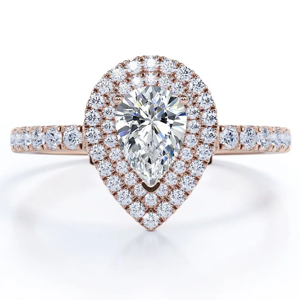 1.5 Carat Pear Cut Moissanite - Duo Halo Setting - Pave Design Engagement Ring - 18K Rose Gold Plating over Silver
