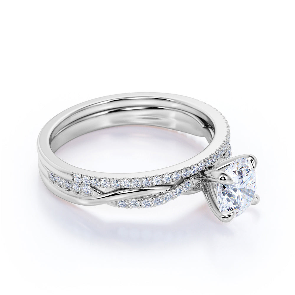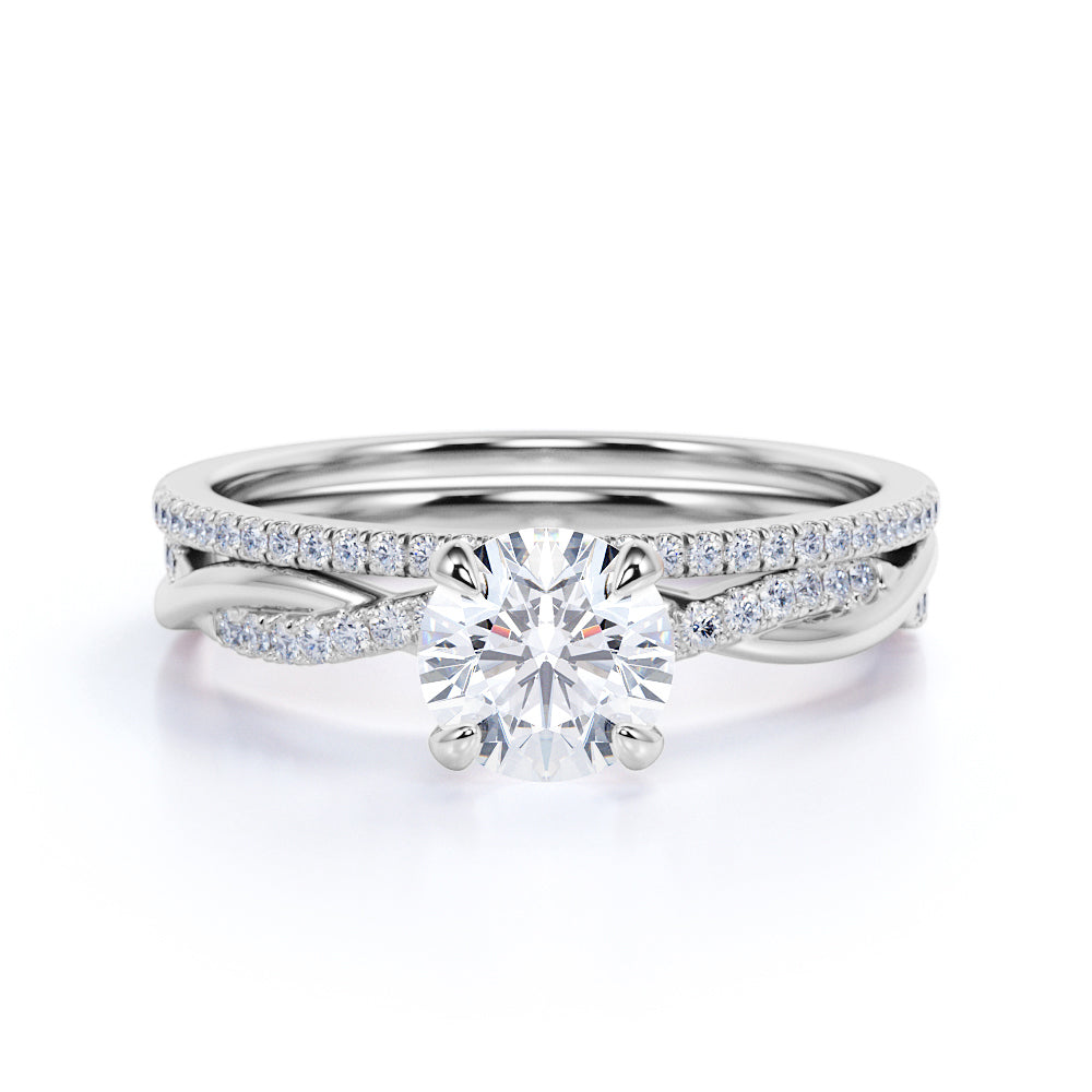Luxurious quality at affordable price, this 1.5 Carat Round cut Moissanite and Diamond infinity multi-stone Bridal Wedding Ring Set in White Gold.The matching bridal wedding ring set features Round cut moissanite with diamonds for a total carat weight of 1.5 carats and is made in solid 10k White Gold. The order comes with 14 days full refund policy.