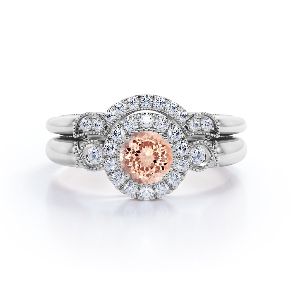 1.5 Carat Round Cut Peach Morganite and Diamond Bridal Ring Set in 10k White Gold Stunning Ring