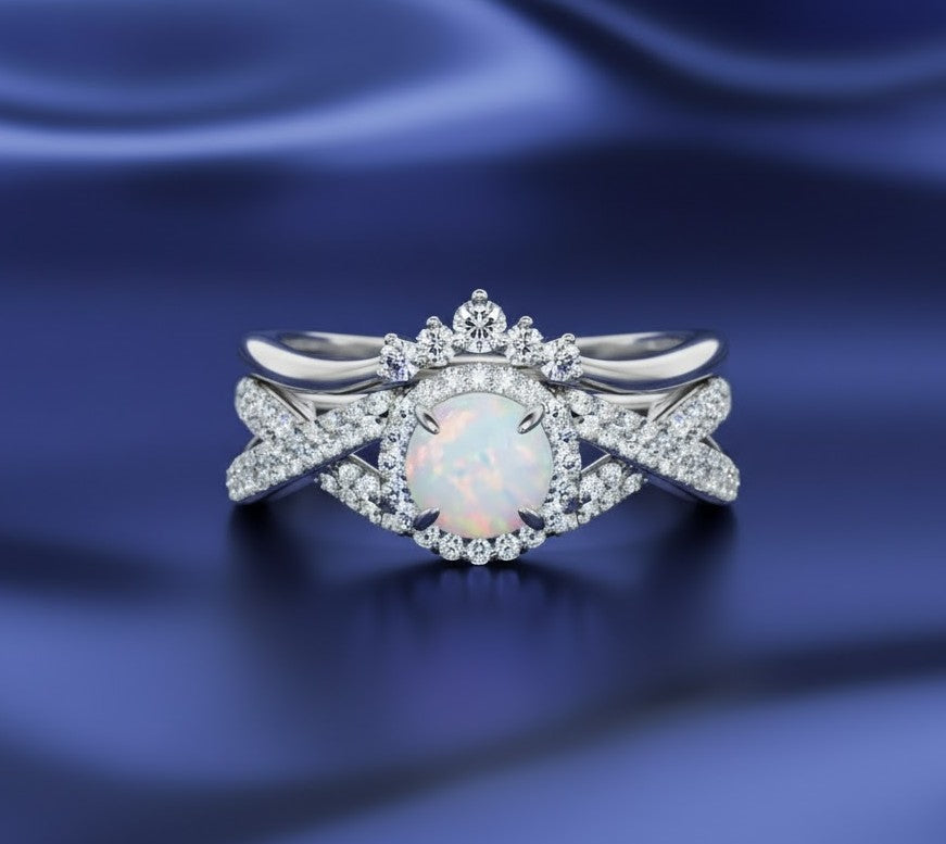 Radiating ethereal beauty, this 1-carat round Lab Opal bridal set shimmers with a mesmerizing play of colors, symbolizing love and harmony. The elegant twisted band design is adorned with sparkling accents that enhance the opal’s iridescent glow. Side stones are Moissanite, adding a touch of brilliance and fire to the enchanting design. Crafted in polished sterling silver, this set beautifully blends modern elegance with timeless romance. A perfect choice for brides who adore a dreamy, luminous sparkle that stands out with grace.