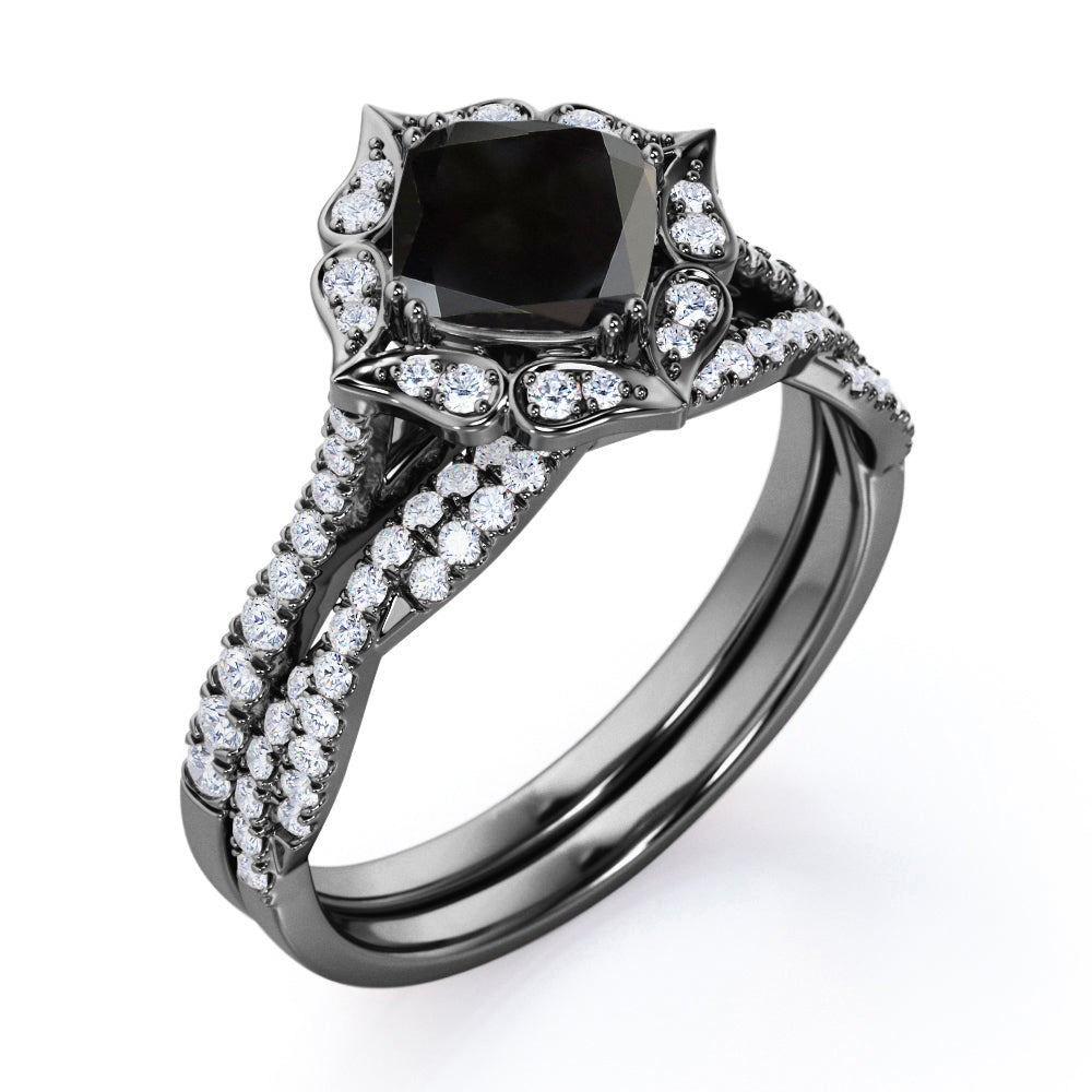 1.50 carat cushion cut Black Diamond infinity bridal set in white gold. Embark on a new episode of your life with our Black Diamond halo bridal set. The cushion cut Black Diamond in the center weighs 1 carat and the sizzling diamonds around and of the wedding band weighs .50 carat which makes 1.50 carat total weight of this bridal set. This antique infinity ring in white gold is as classic and timeless as it looks. The unique art deco on the edges of the center stone acts like a cherry on the top which gives the perfect finish to this divine bridal set. Press the add to cart button to make this yours. This 1.50 carat cushion cut Black Diamond infinity bridal set in white gold can also be customized to 10k Gold, 14k Gold.