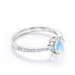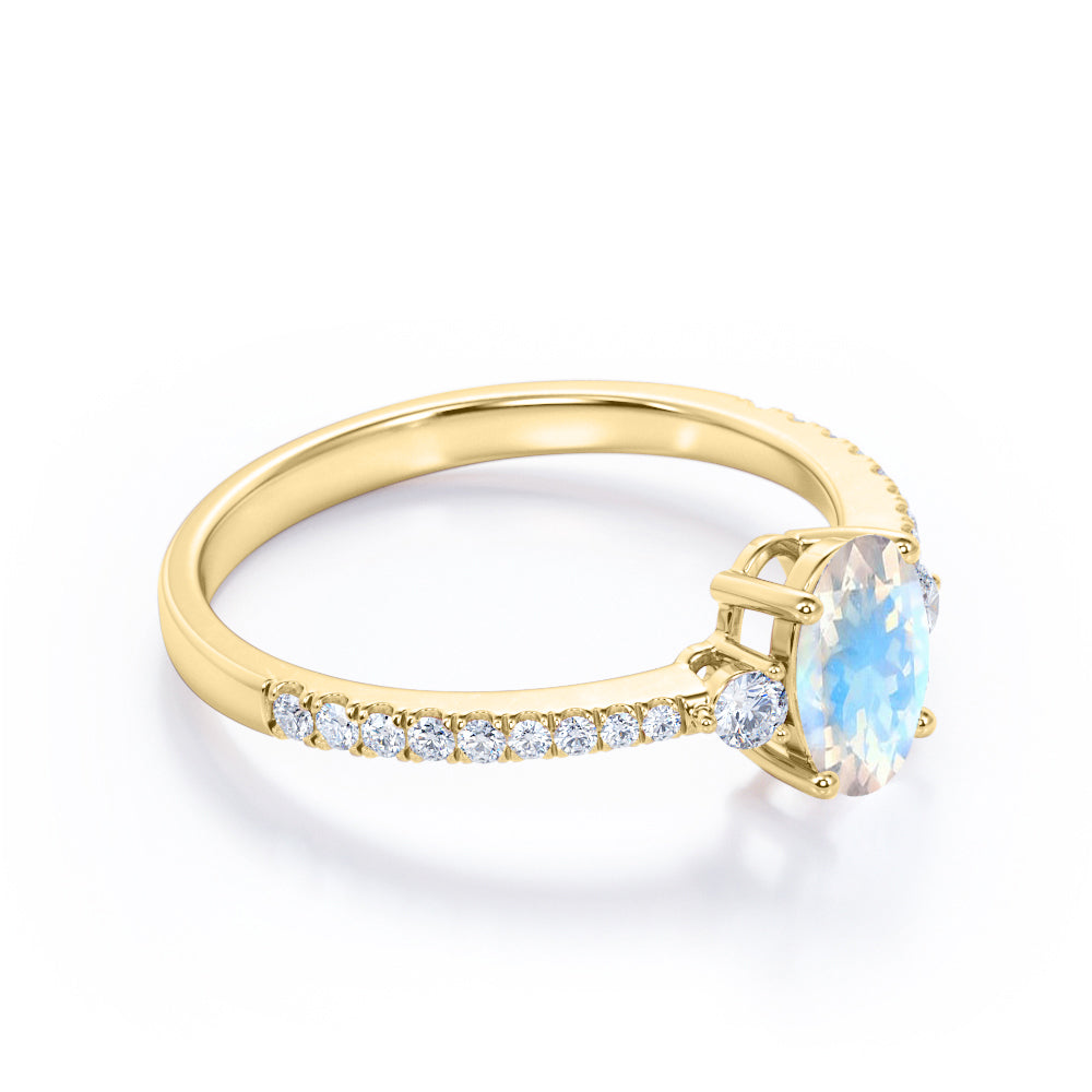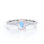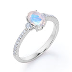 Enchanting on its own way, this rainbow moonstone and diamond engagement ring displays a variety of colors from different angles when being passed by a light source. This moonstone wedding ring features an approximately 1 carat oval natural rainbow moonstone, surrounded by .50 carat real diamonds for gold ring and moissanite for silver ring, for a total weight of 1.50 carats.