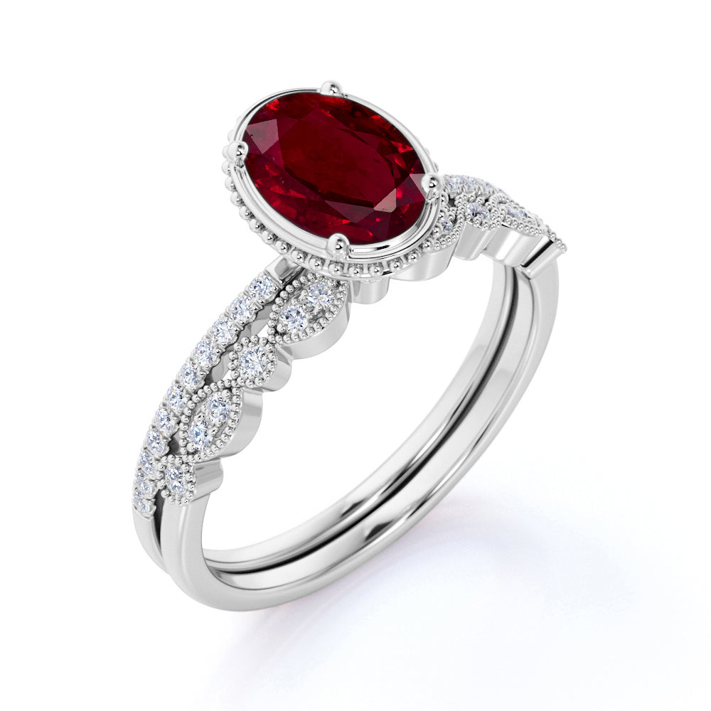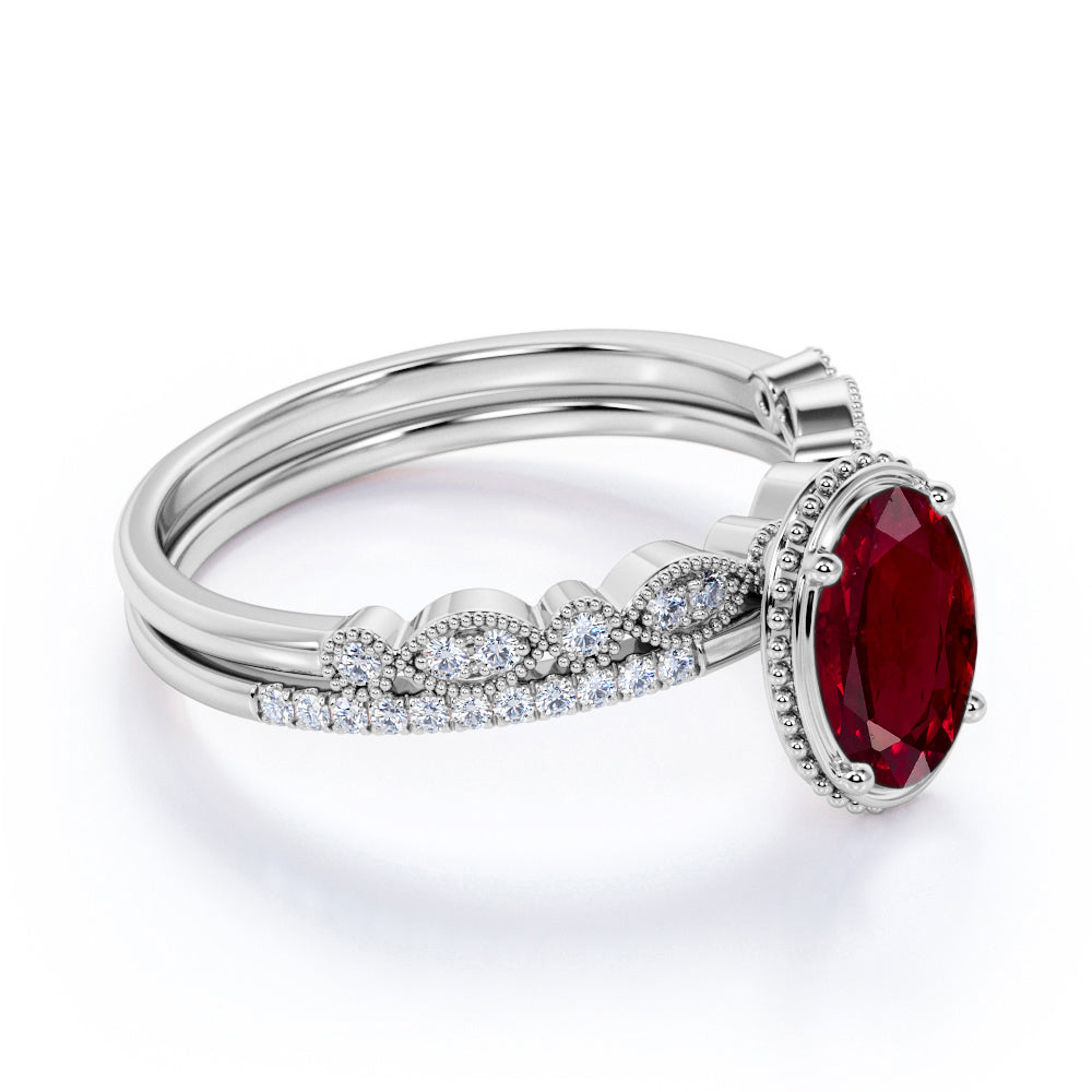 1.50 Carat Oval Natural Lab Ruby Wedding Set - Milgrain Ring - 18k White Gold over Silver