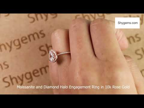 1.50 Carat pear cut Moissanite and Diamond Halo Engagement Ring in 10k Rose Gold. The ring is made with real Moissanite, real white diamonds, and on real solid 10k Gold. The order comes with Jewelry Certificate, limited Warranty and 30 Days Full Refund policy. Although each ring is handmade and customized to your specifications, but we guarantee a FAST DELIVERY.