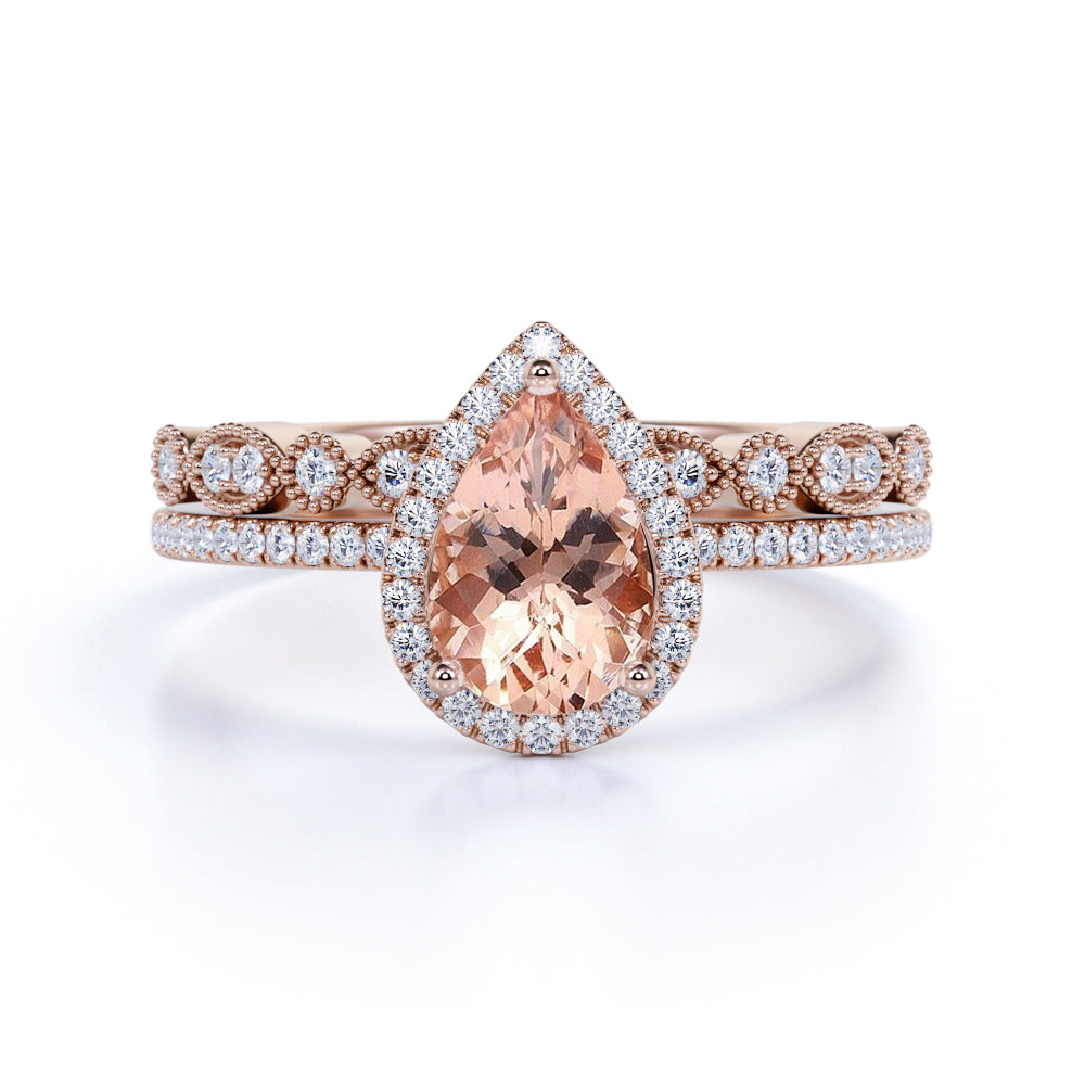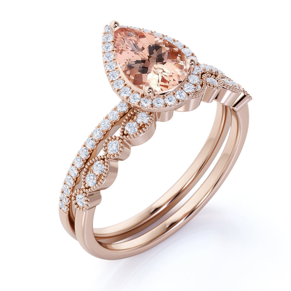 Halo 1.50 ct Pear Real Morganite Vintage Bridal Set