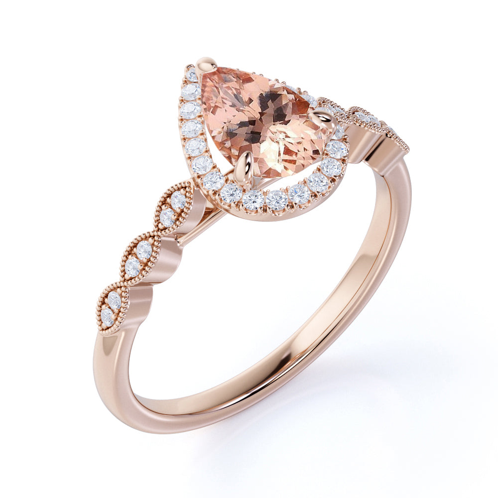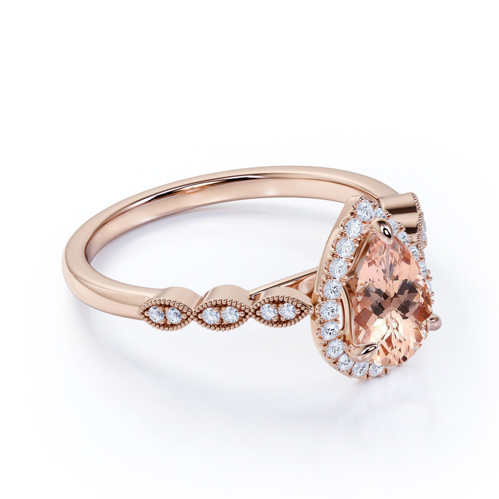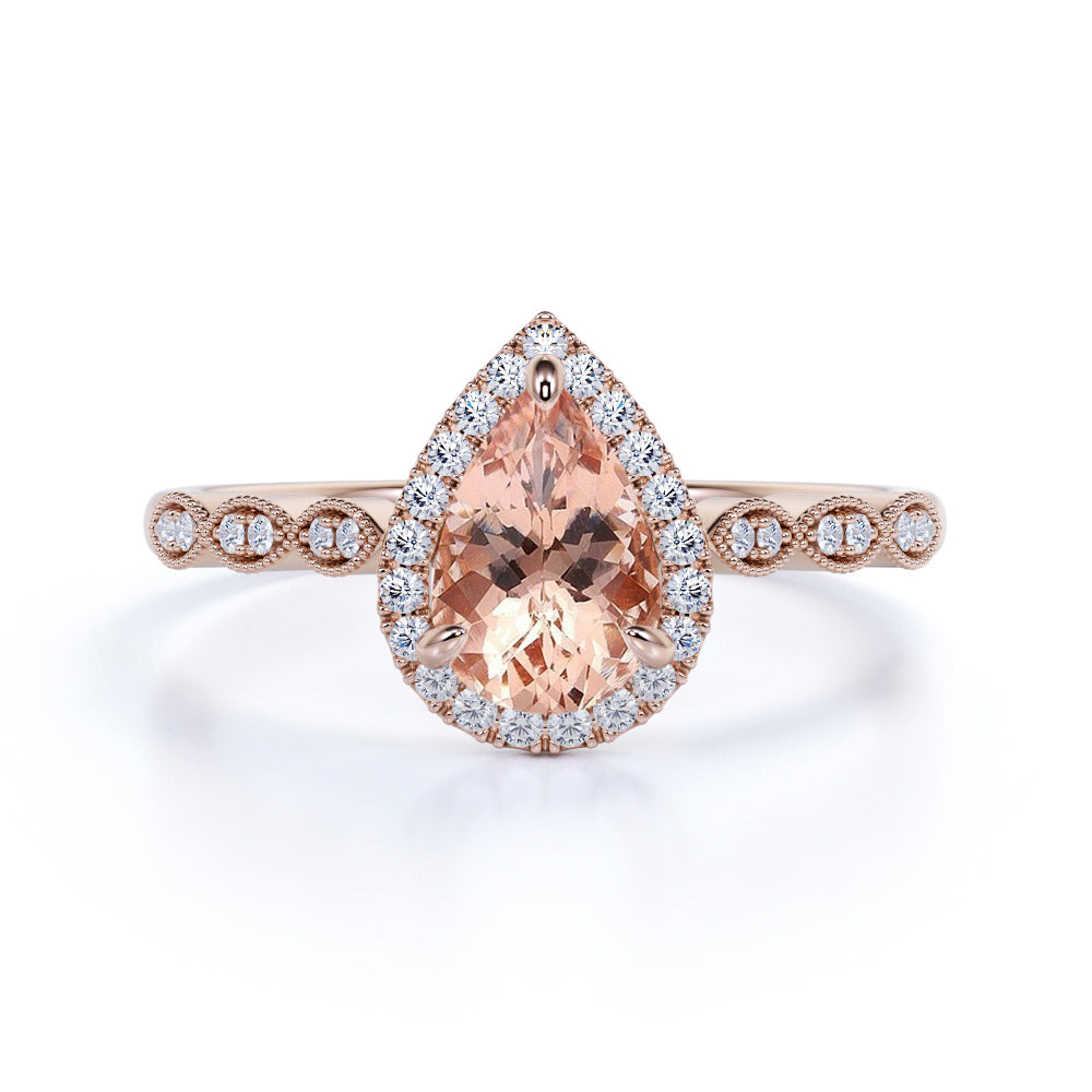 1.50 Carat Pear Cut Real Peach Pink Morganite Halo Engagement Ring in 18k Rose Gold over Silver
