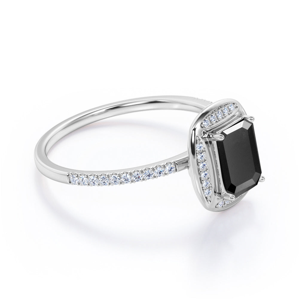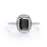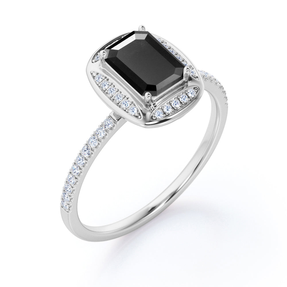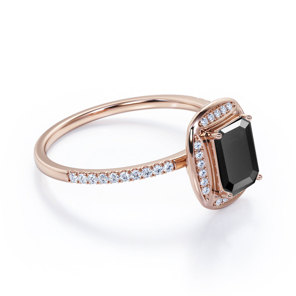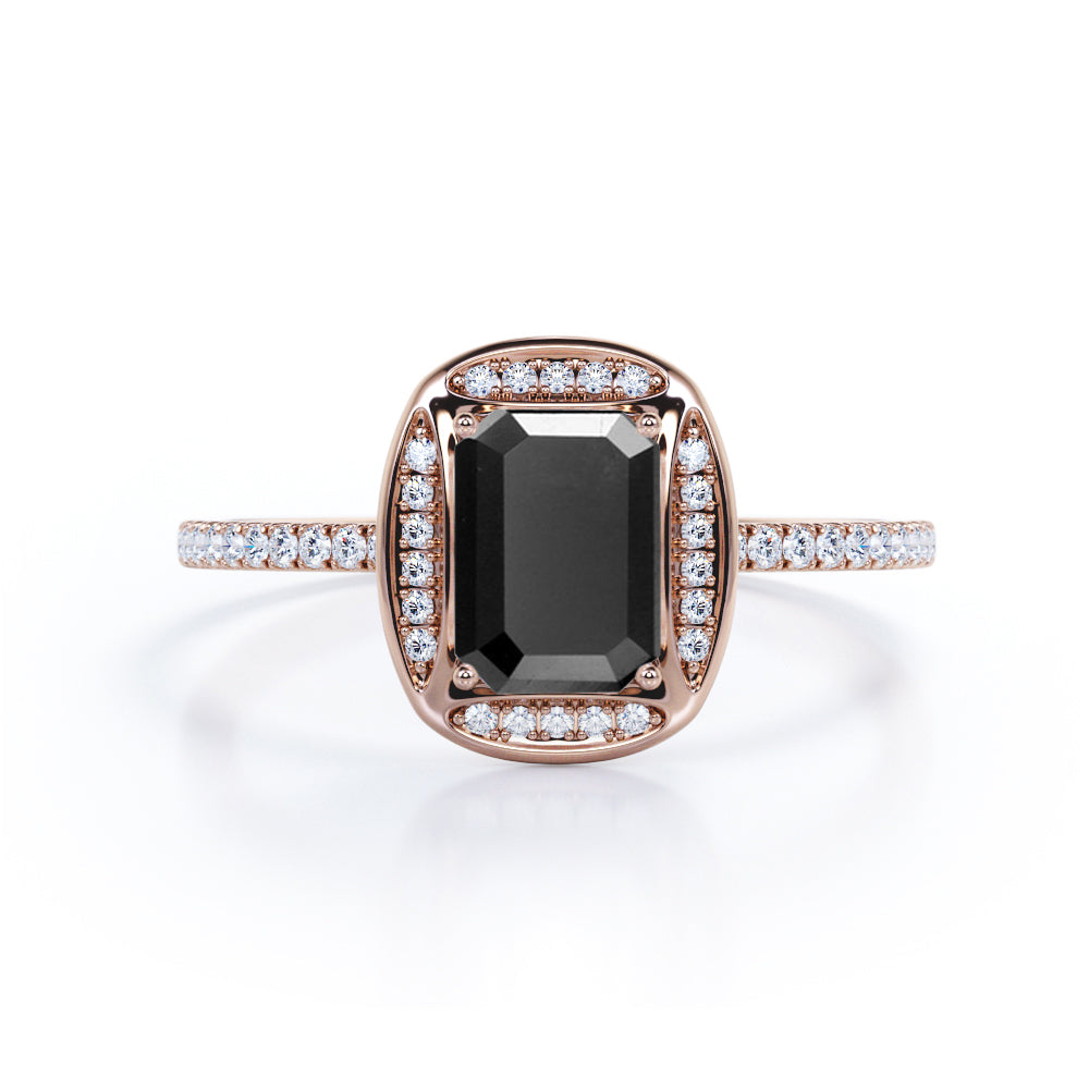1.50 Carat Emerald cut Lab Black Diamond Bezel Set Engagement Ring for Women in Rose Gold. Superbly crafted vintage design sparkling black Diamond bridal ring set, perfect for her, highlights total 1.5 carats perfect lab created black diamond and glittering diamonds and is made in solid 10k Rose Gold. This piece of jewelry is handmade, sporting quality craftsmanship that will last for years to come. And as always, the order comes with our 30 DAYS FULL REFUND policy, GUARANTEED DELIVERY within 5 Days, and in a BEAUTIFUL Jewelry Ring Box.