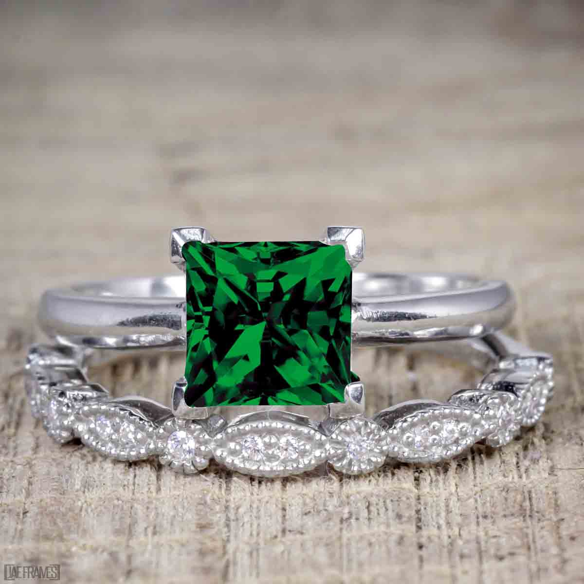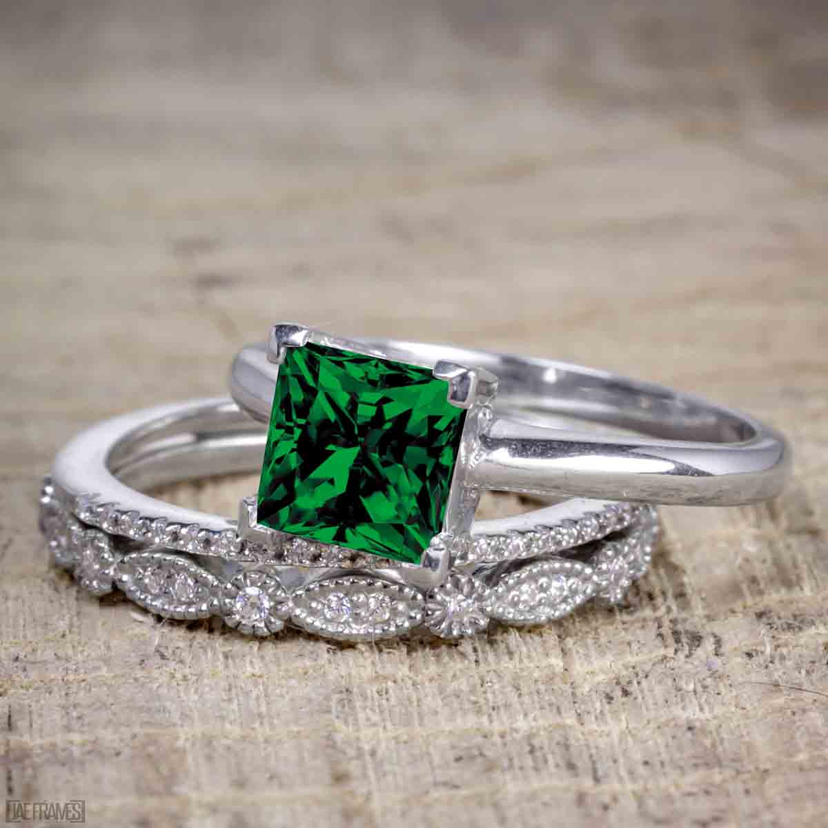 When you are looking for engagement rings, wedding rings, promise rings, anniversary rings, or any other rings, your mind may automatically think of diamond rings. But that doesn't have to be your only option. This 1.50 Carat Princess cut Emerald and Moissanite Handmade Trio Wedding Ring Set 18k White Gold over Silver will show you why. Known as the birthstone for May, this stunning ring design is highlighted by the breathtaking green Emerald. Crafted in precious 18k Gold over Silver, this May birthstone ring is very durable. It features 1 carat princess cut Green Emerald and 0.50 carat moissanites that can be a perfect alternative to diamonds as moissanites have almost the same durability and quality as with diamonds that will last for a lifetime. Also, as your satisfaction is our most priority, we will do our best to have your handmade jewelry be carefully and beautifully crafted by our expert jewelers. The order also comes with a 30-day full refund policy.