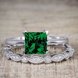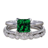 1.50 Carat Princess cut Emerald and Moissanite Handmade Trio Wedding Ring Set 18k White Gold over Silver