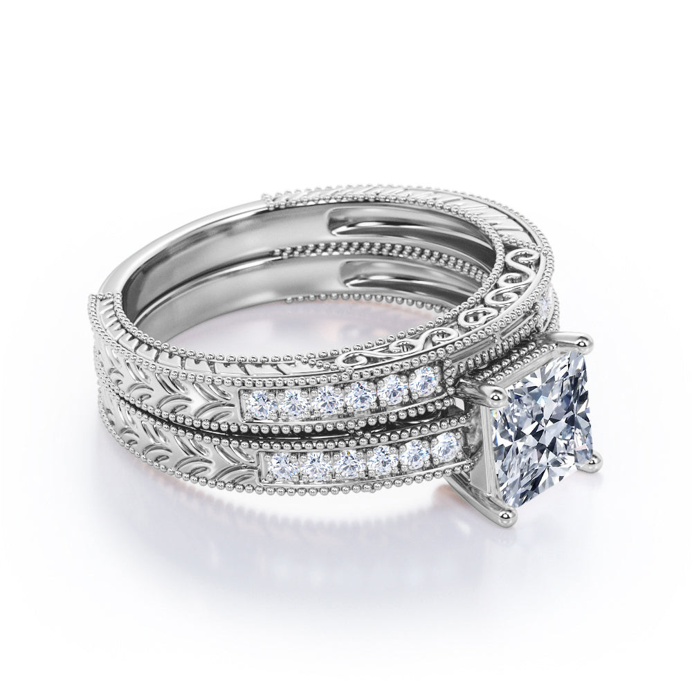 1.50 carat princess cut Moissanite and diamond vintage milgrain bridal set ring in white gold. If you are searching for a bridal set and you like vintage jewelry, this version of an antique milgrain Moissanite bridal set ring may be just what you are looking for. Our craftsmen created this vintage bridal set design in the style of Victorian and Art Deco periods of our past. The bridal set includes princess cut Moissanite of 1 carat and .25 carat of diamonds in the engagement ring and a matching wedding band paved with sparkling diamonds of .25 carat. This bridal set features detailed milgrain work at the edges which is extremely eye-pleasing. This 1.50 carat princess cut Moissanite and diamond vintage milgrain bridal set ring in white gold can also be customized to 18k Gold plating over silver, 10k Gold, 14k Gold or 18k Gold.