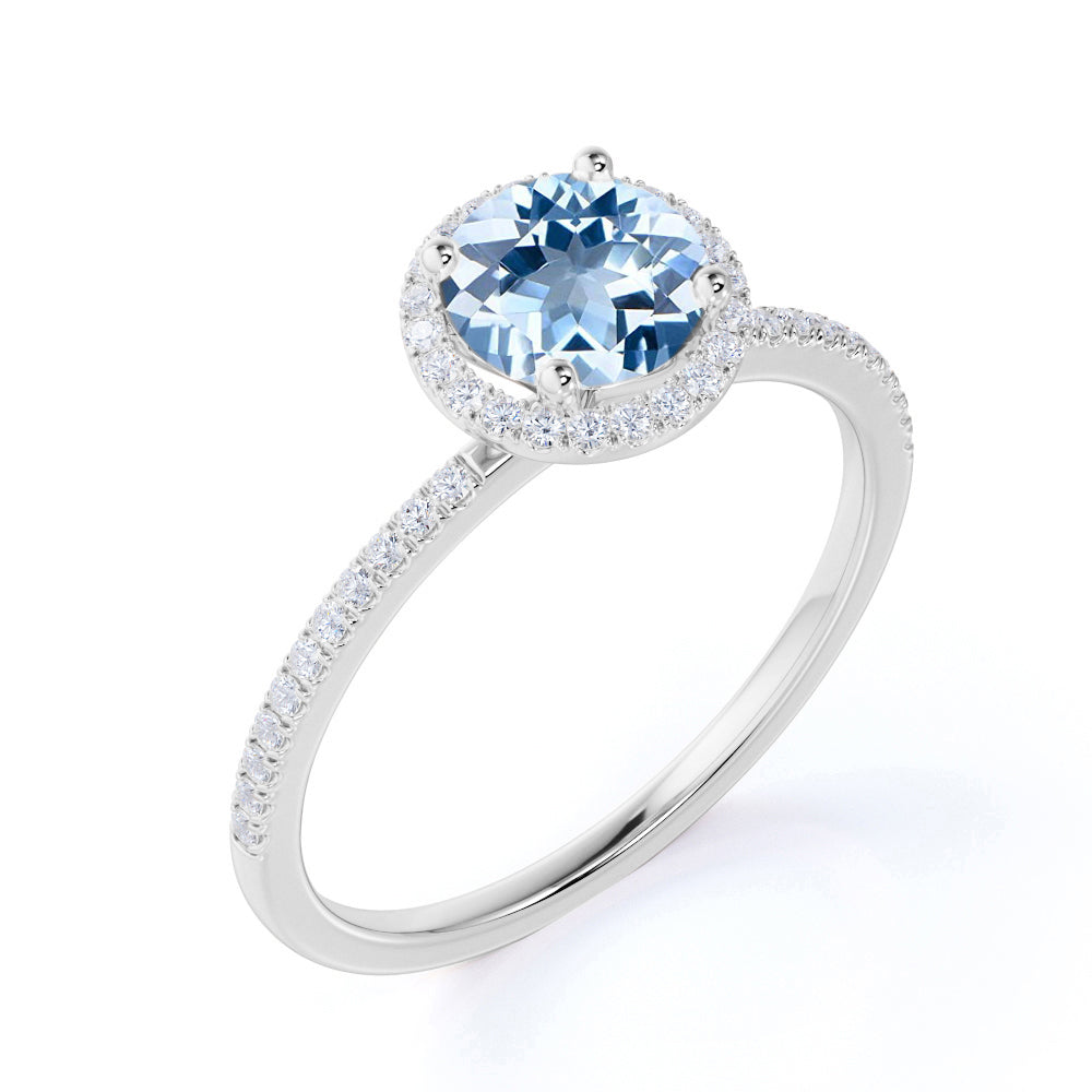 1.50 Carat Round cut Aquamarine and Diamond Halo Engagement Ring in Rose Gold. Handmadesparkling aquamarine engagement ring showcases total 1.5 carats perfect real blue aquamarine and glittering diamonds and is made in solid 10k Rose Gold. This piece of jewelry is handmade, sporting quality craftsmanship that will last for years to come.And as always, the order comes with our 30 DAYS FULL REFUND policy, GUARANTEED DELIVERY withing 5 Days, and in a BEAUTIFUL Jewelry Ring Box.