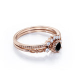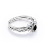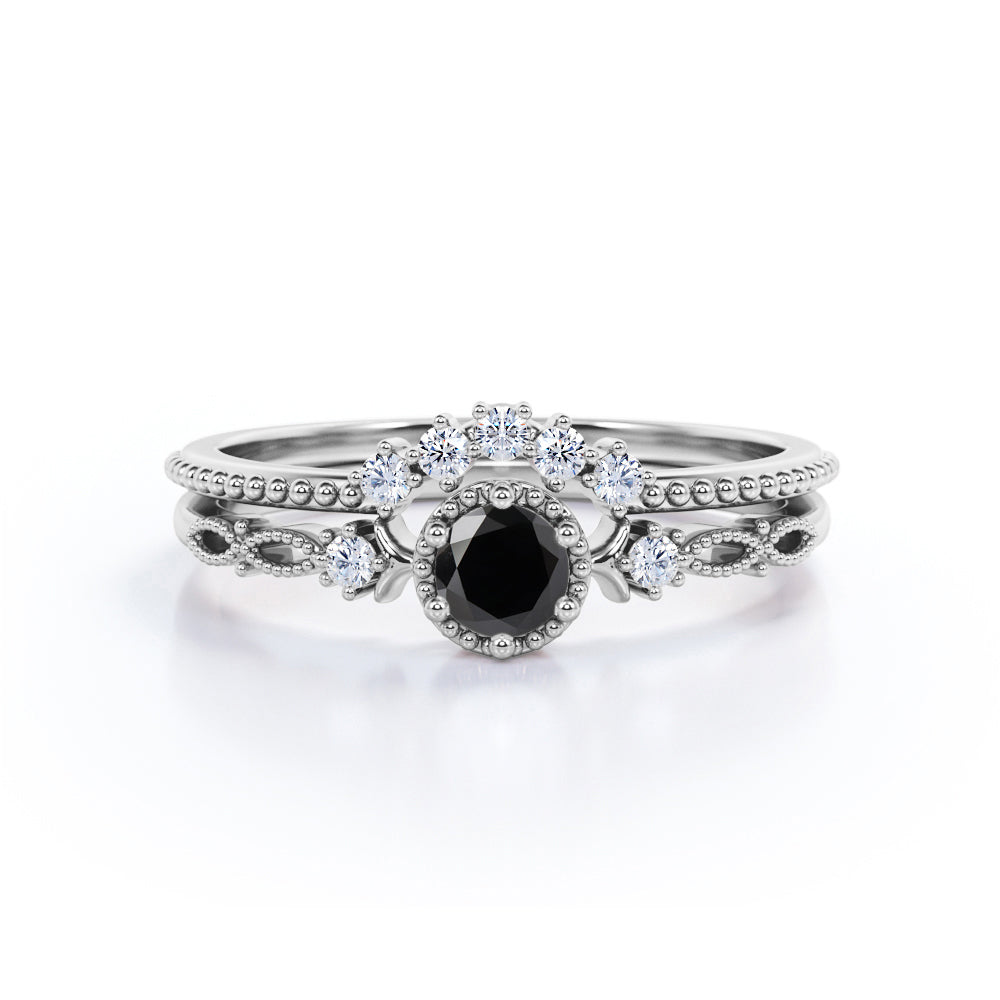 0.75 Carat Round cut Lab Created Black Diamond Solitaire Bridal Ring Set in White Gold. Wonderful vintage design sparkling black Diamond bridal ring set, perfect for her, features total 0.75 carats perfect lab created black diamond and glittering diamonds and is made in solid 10k White Gold. The beautiful wedding ring band is handmade and personalized by me or one of my other skilled jewelry associates with over 15 years of experience. And as always, the order comes with our 30 DAYS FULL REFUND policy, GUARANTEED DELIVERY within 5 Days, and in a BEAUTIFUL Jewelry Ring Box.