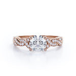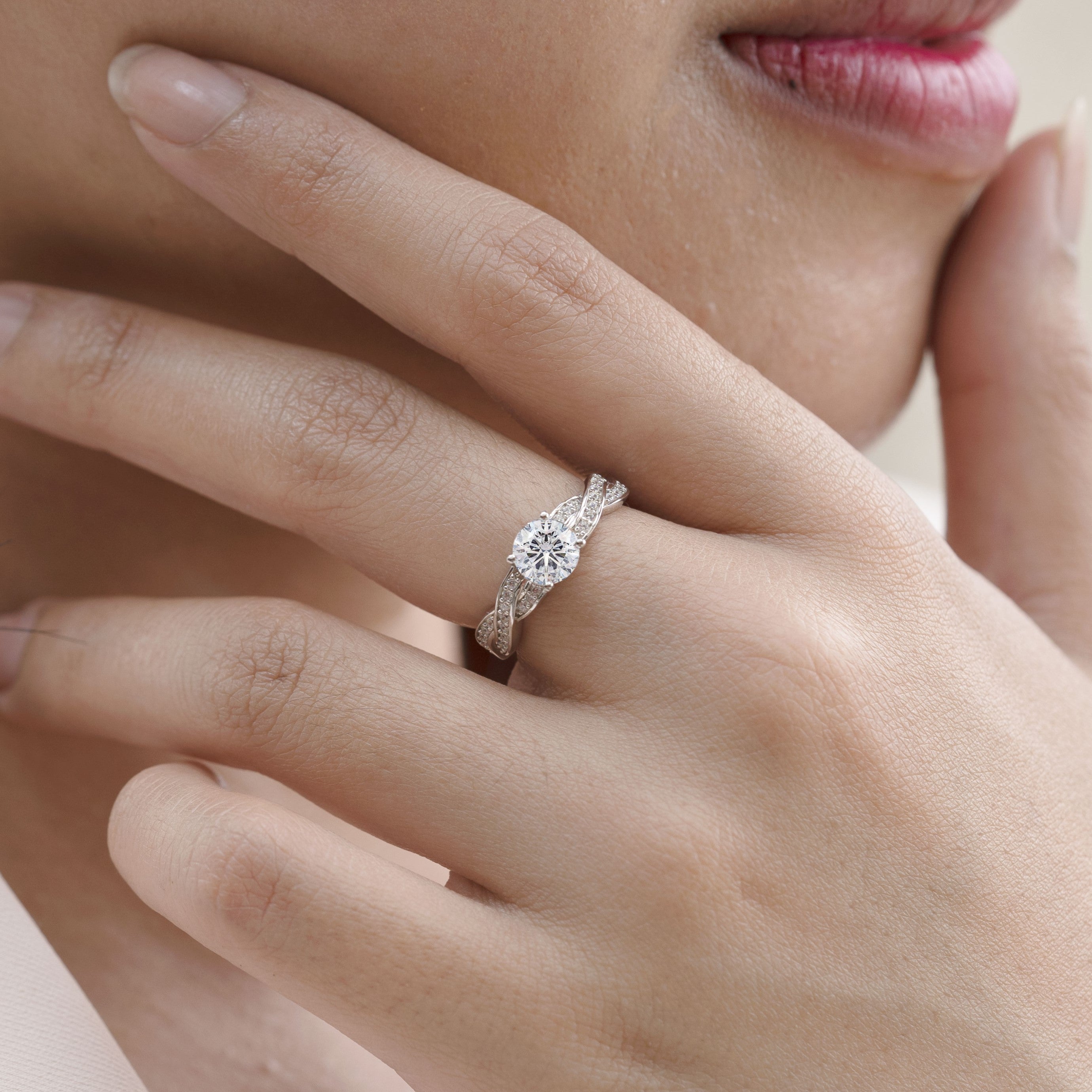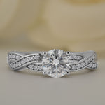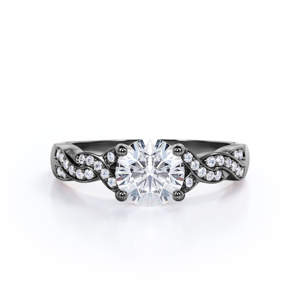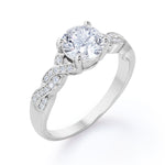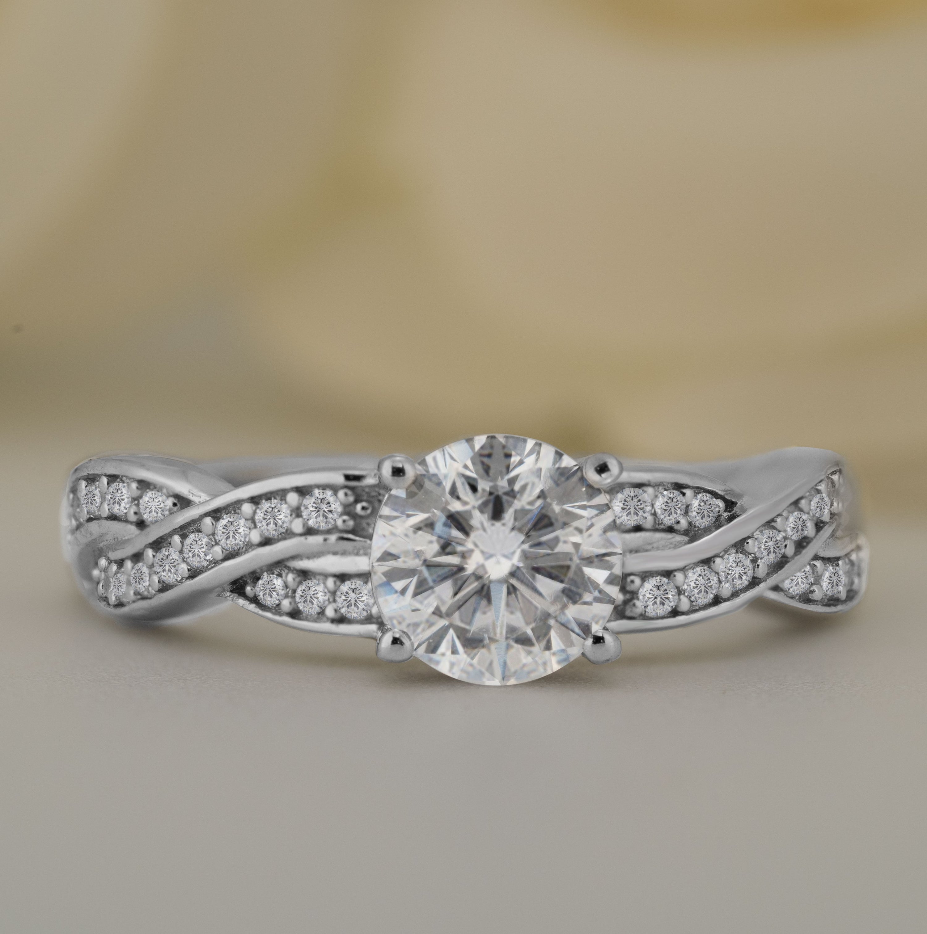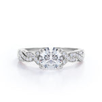 1.50 Carat Round Cut Moissanite And Diamond Solitaire Engagement Ring In White Gold. Can't stop staring at it? Just make this stunning Moissanite and diamond engagement ring yours by adding it to your cart. The round cut Moissanite in the center is 1 carat and the dazzling diamonds around weighs .50 carat which combined together makes 1.50 carat total weight for this engagement ring. The channel setting in the ring enhances the overall sparkle of this infinity engagement ring. This solitaire ring features VS clarity and G-H color. Quality like this is rare. Grab it while you can, you are going to love it. This 1.50 carat round cut Moissanite and diamond solitaire engagement ring in white gold also be customized to 18k Gold plating over silver, 10k Gold, 14k Gold or 18k Gold.