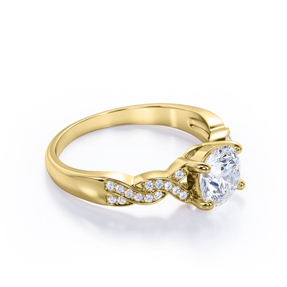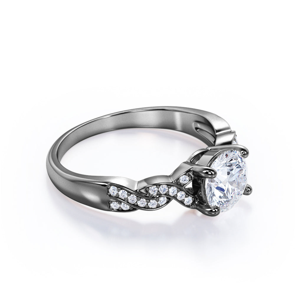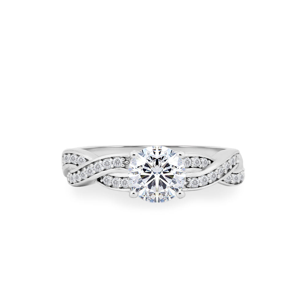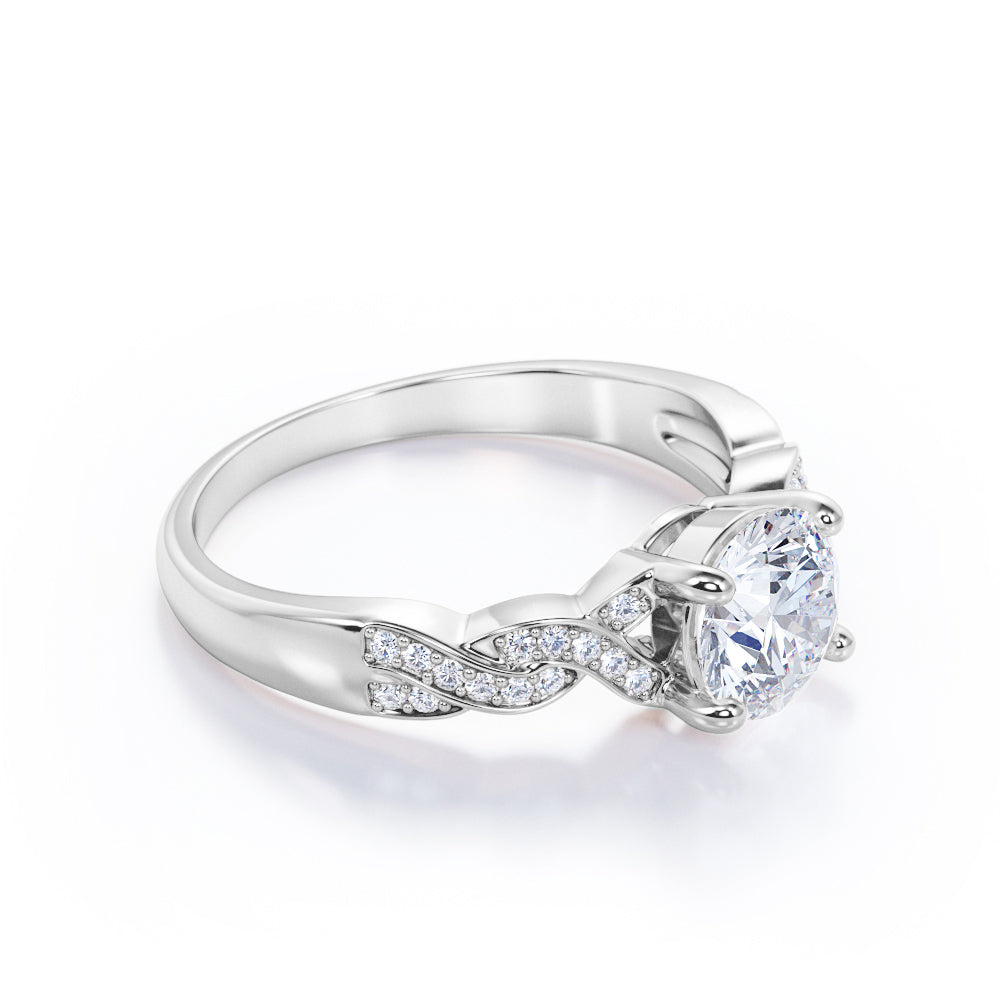 1.50 Carat Round Cut Moissanite And Diamond Solitaire Engagement Ring In White Gold. Can't stop staring at it? Just make this stunning Moissanite and diamond engagement ring yours by adding it to your cart. The round cut Moissanite in the center is 1 carat and the dazzling diamonds around weighs .50 carat which combined together makes 1.50 carat total weight for this engagement ring. The channel setting in the ring enhances the overall sparkle of this infinity engagement ring. This solitaire ring features VS clarity and G-H color. Quality like this is rare. Grab it while you can, you are going to love it. This 1.50 carat round cut Moissanite and diamond solitaire engagement ring in white gold also be customized to 18k Gold plating over silver, 10k Gold, 14k Gold or 18k Gold.
